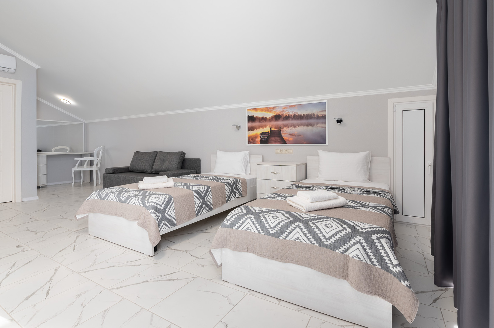 вешалка, диван, зеркало, кровати односпальные /одна двуспальная кровать, прикроватные тумбочки, стол, стулья, шкаф-купе
