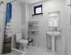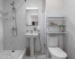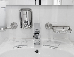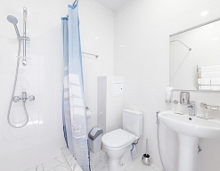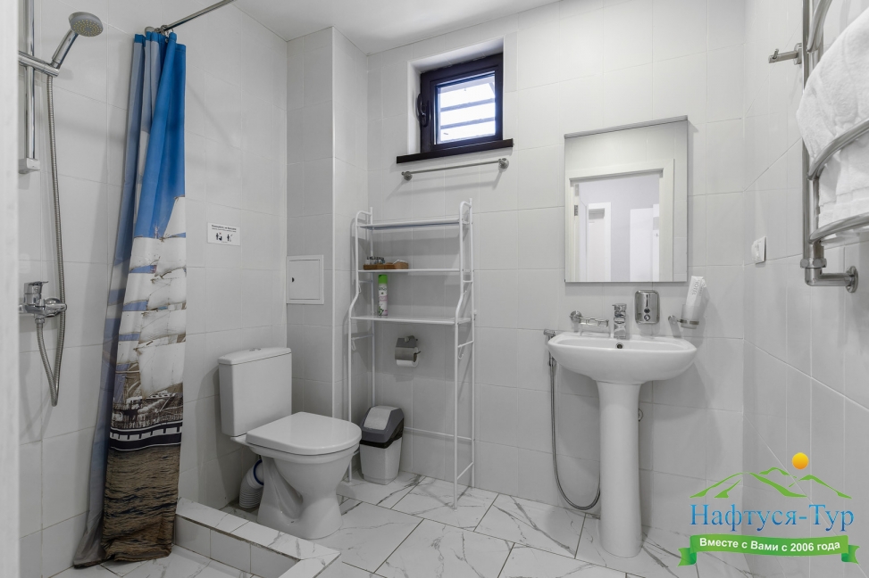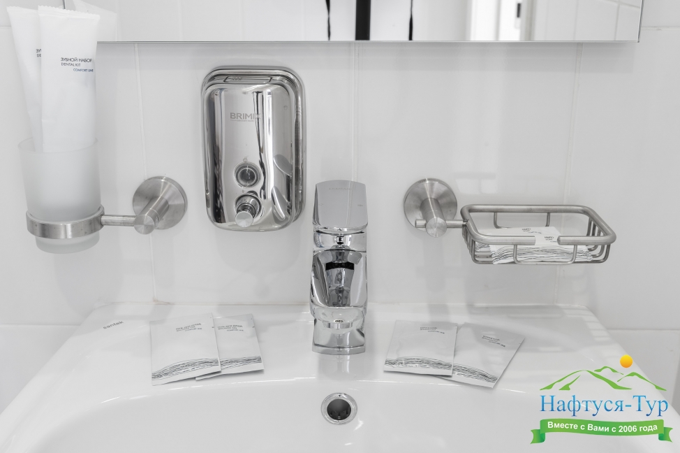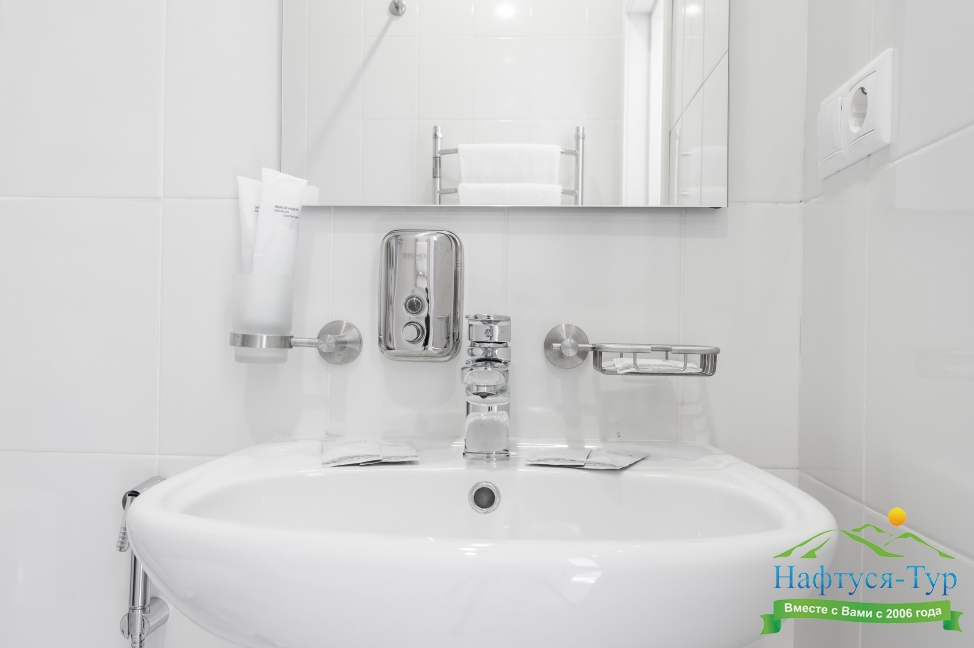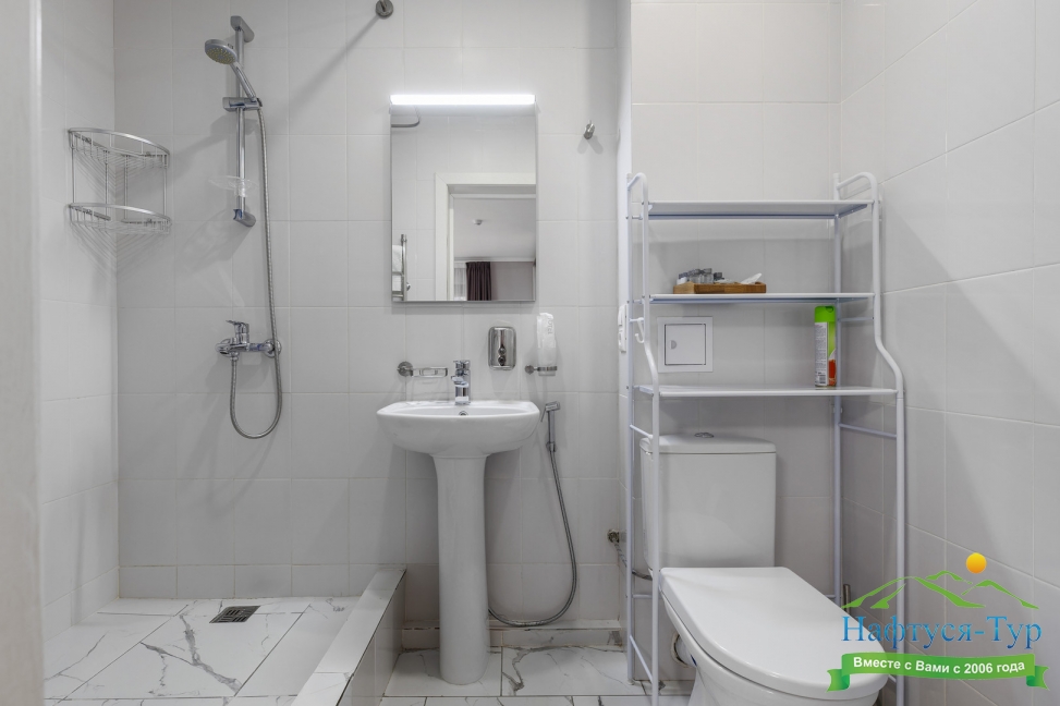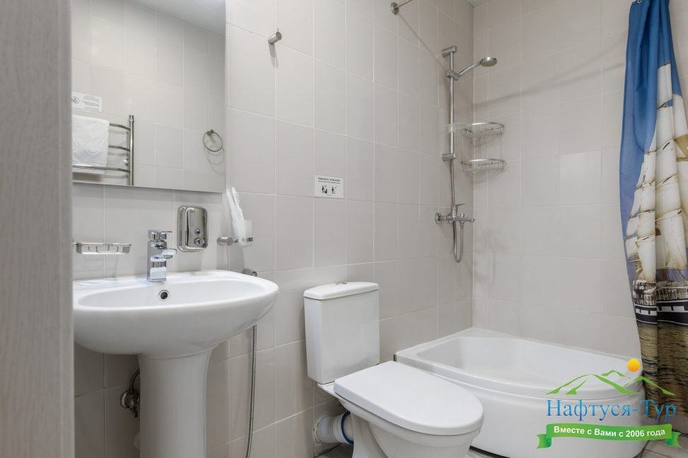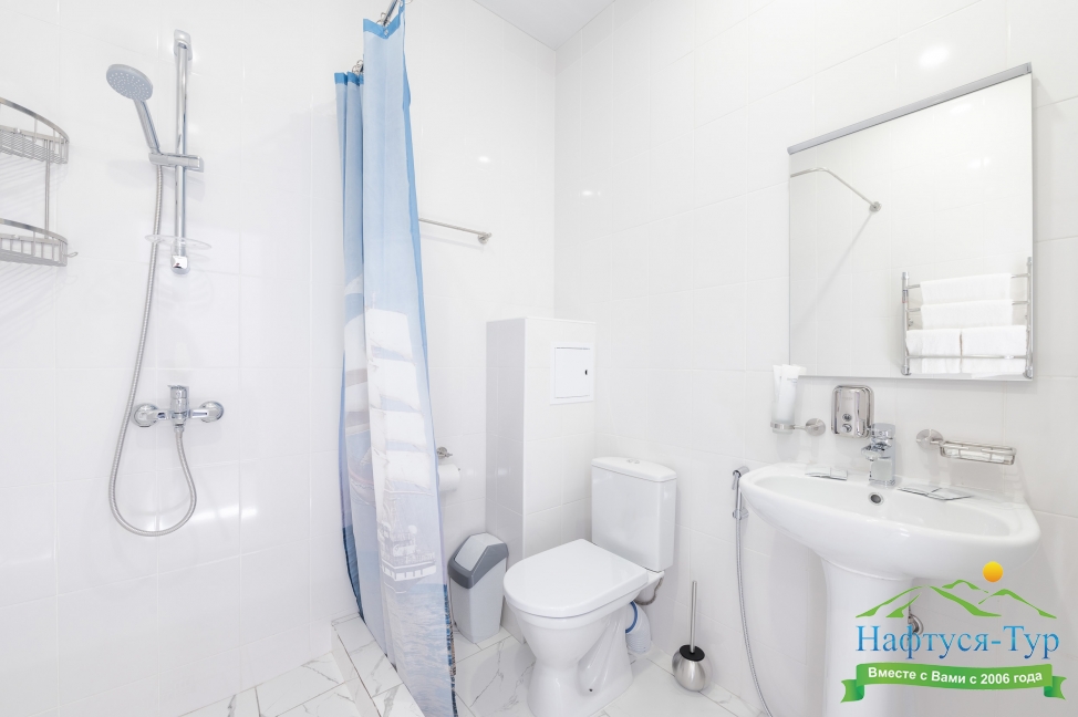 с душем, тапочки, туалетные принадлежности, фен, халат