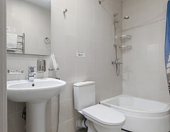 с ванной, тапочки, туалетные принадлежности, фен, халат