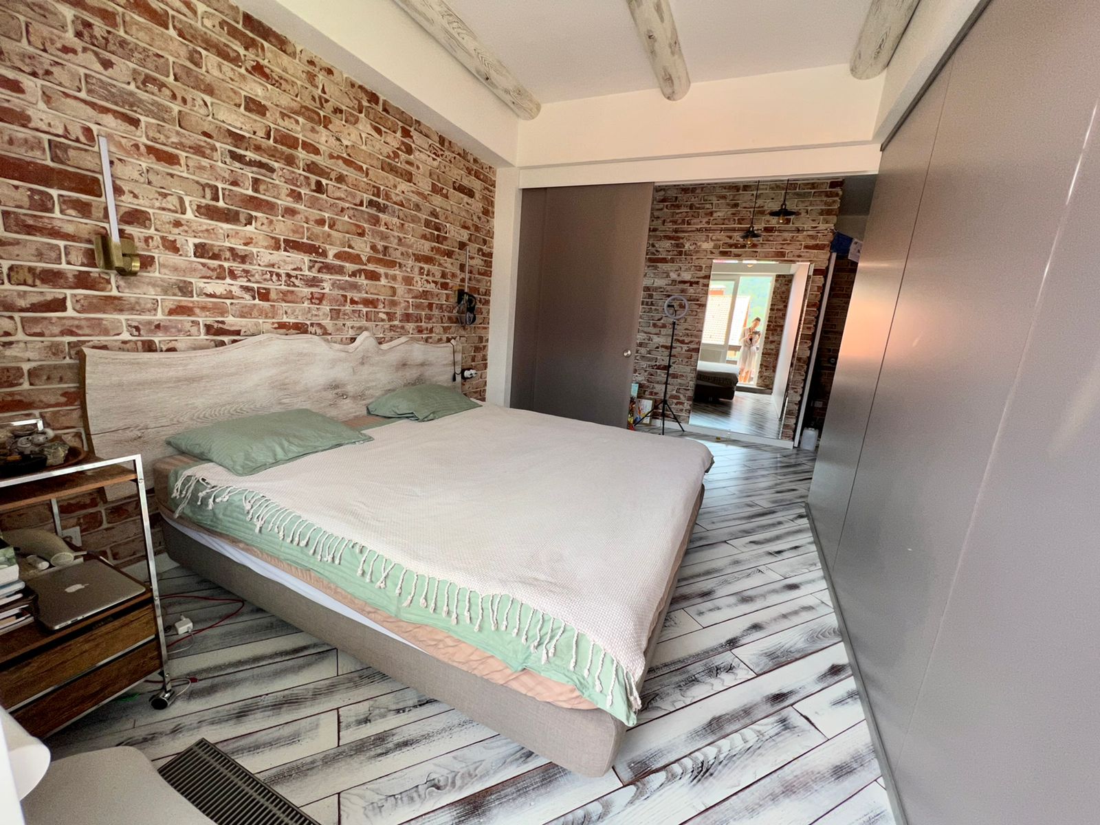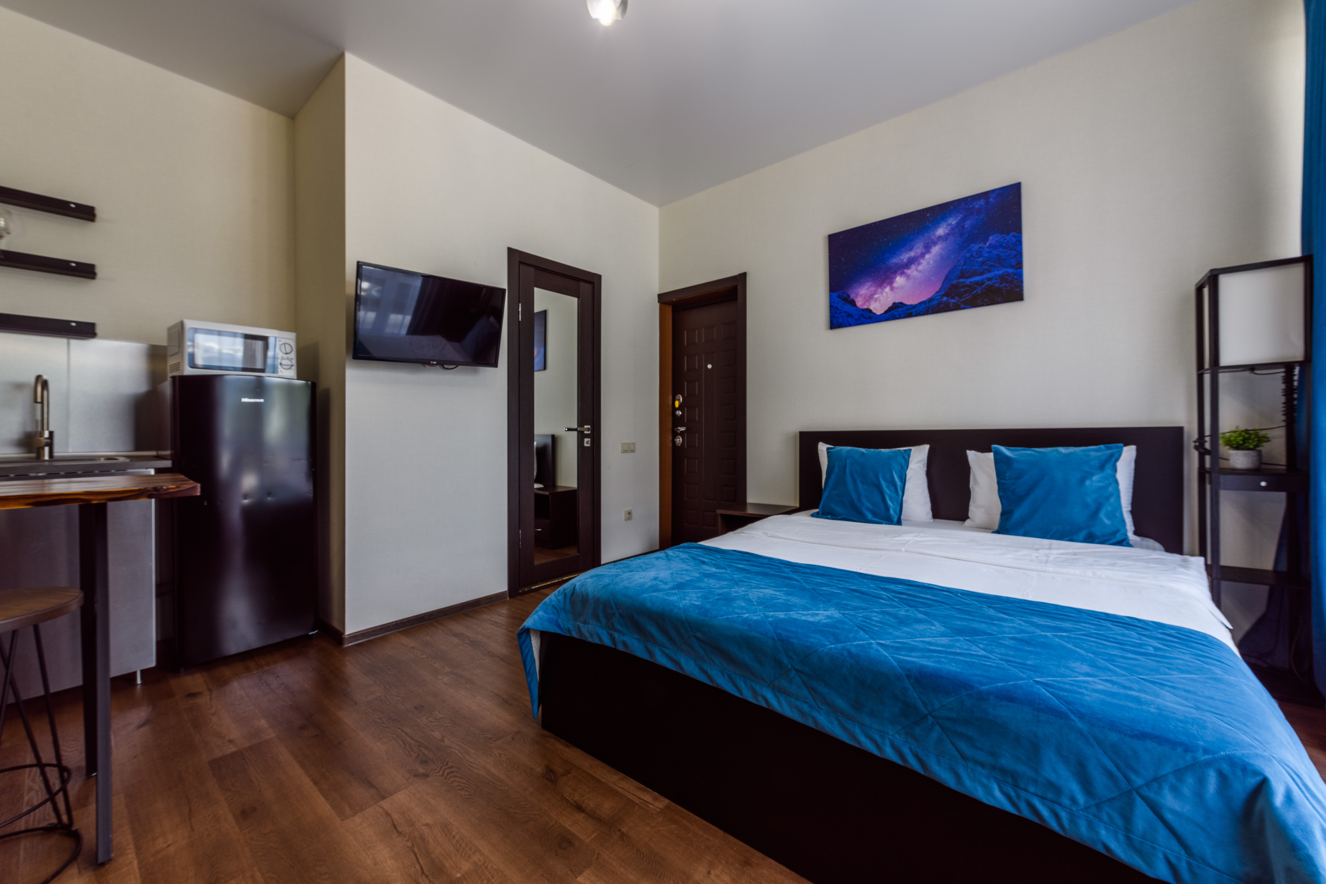 гардеробная, зеркало, кровать двуспальная, прикроватные тумбочки, стол
