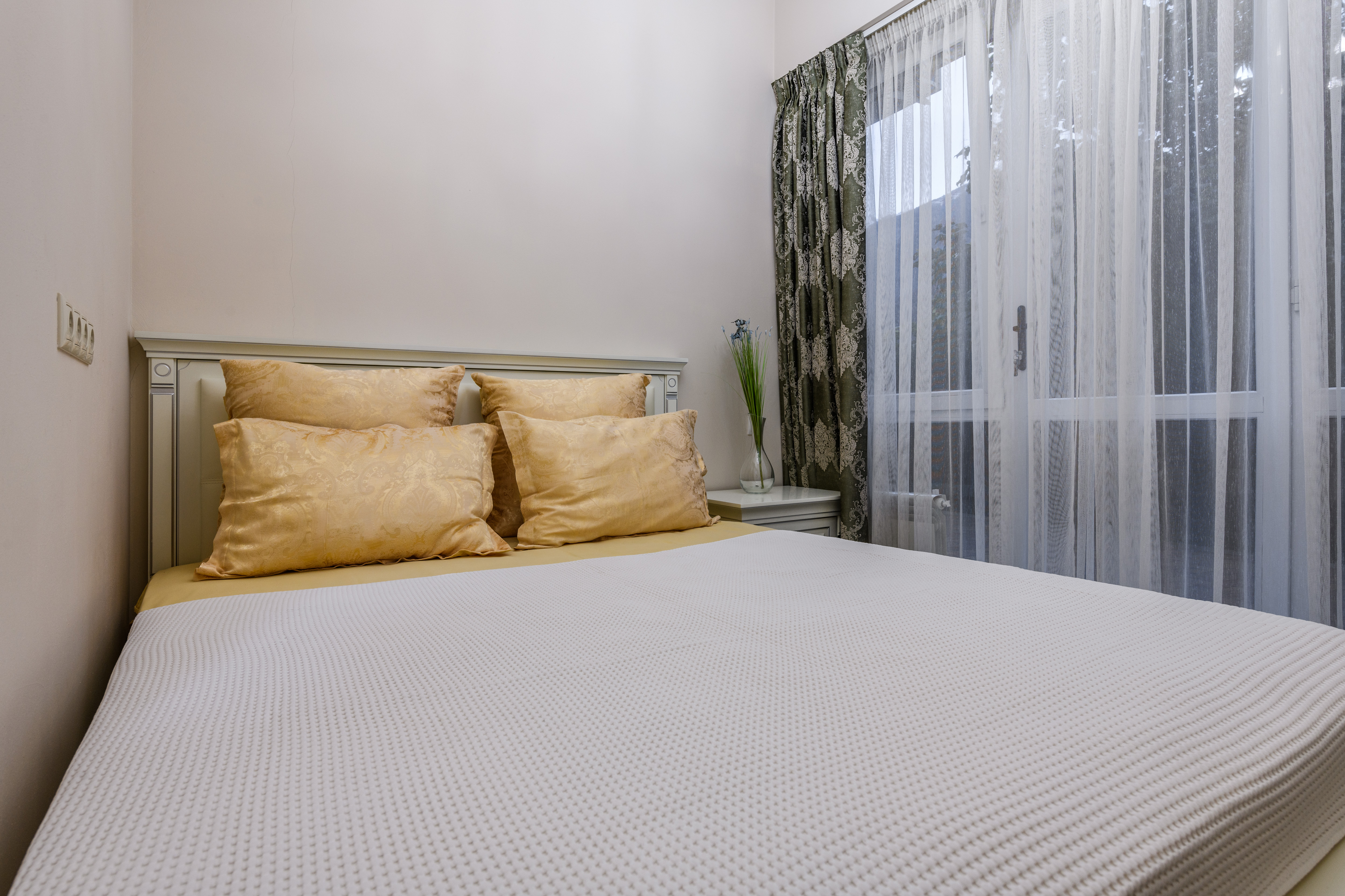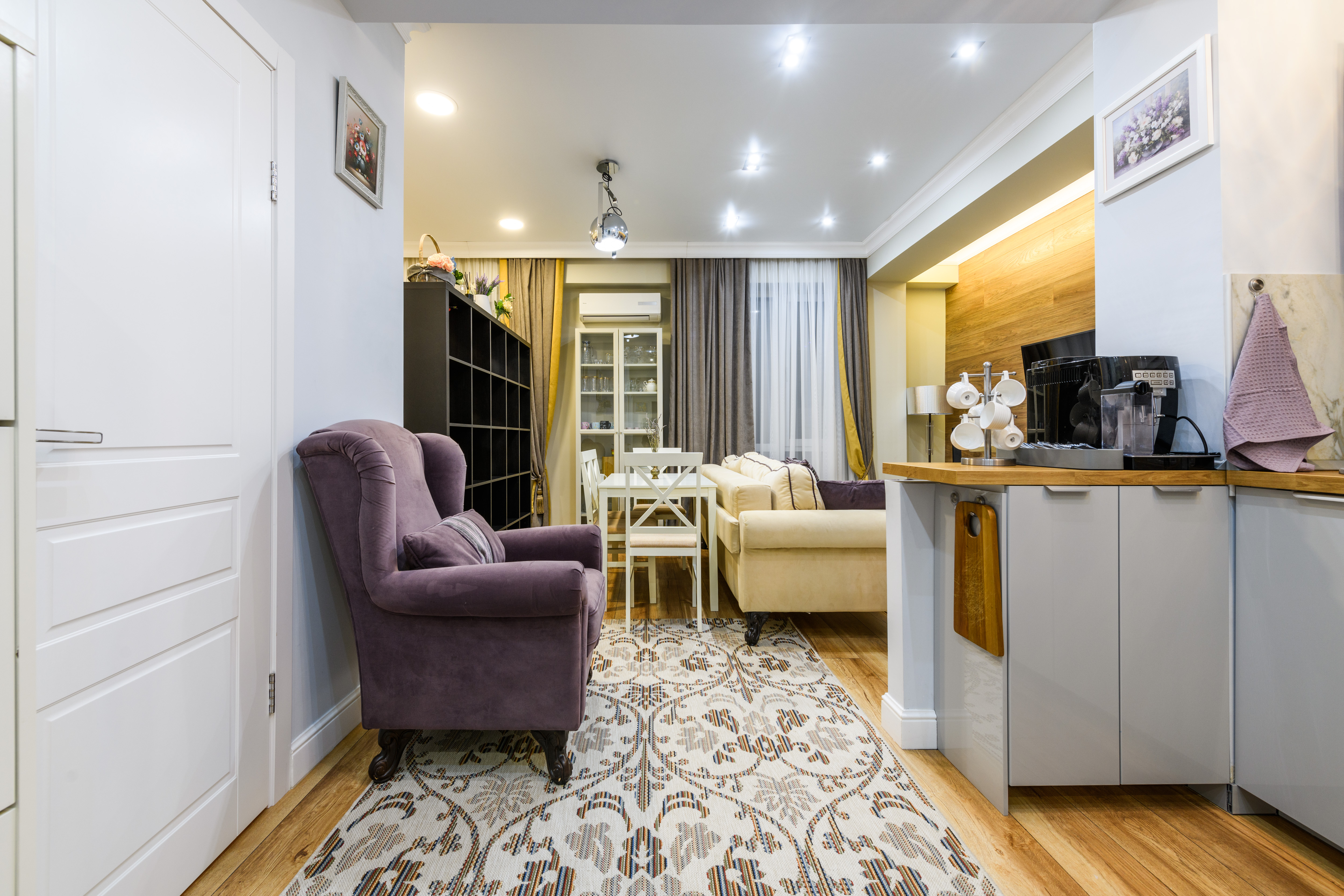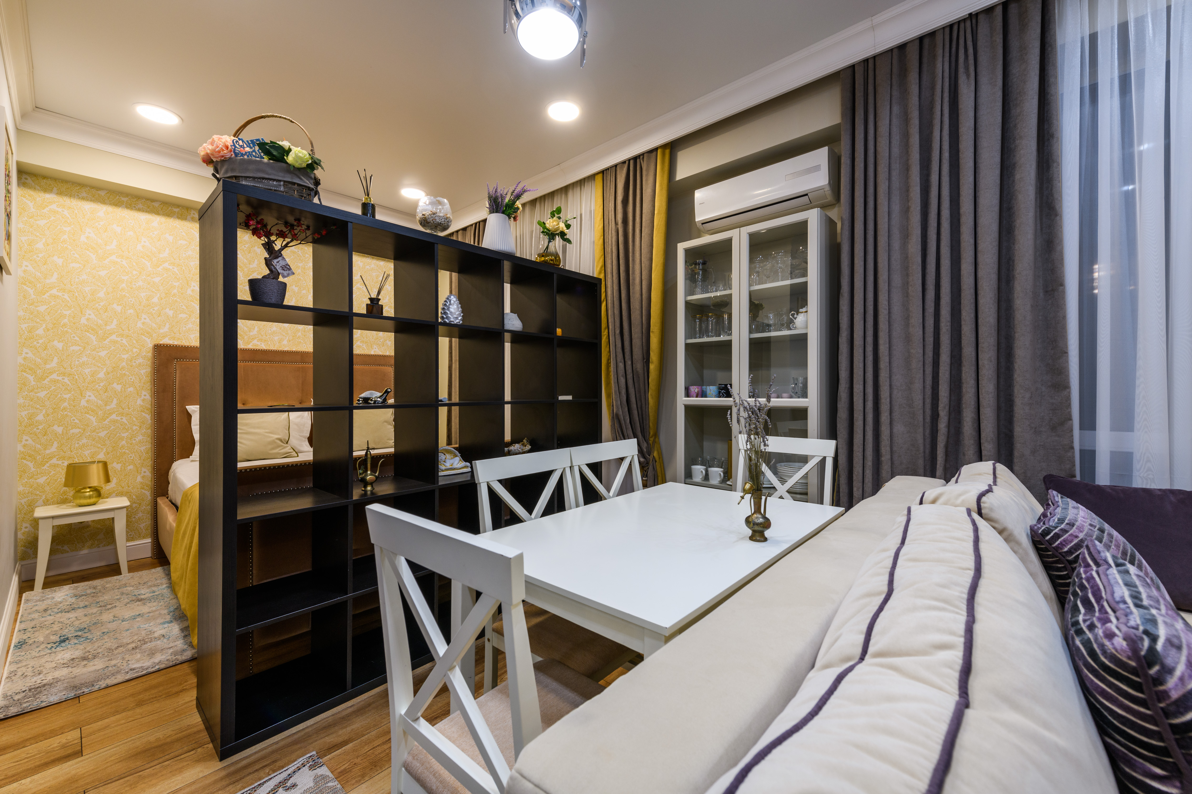 гардеробная, зеркало, кровать двуспальная, прикроватные тумбочки, стол, стулья