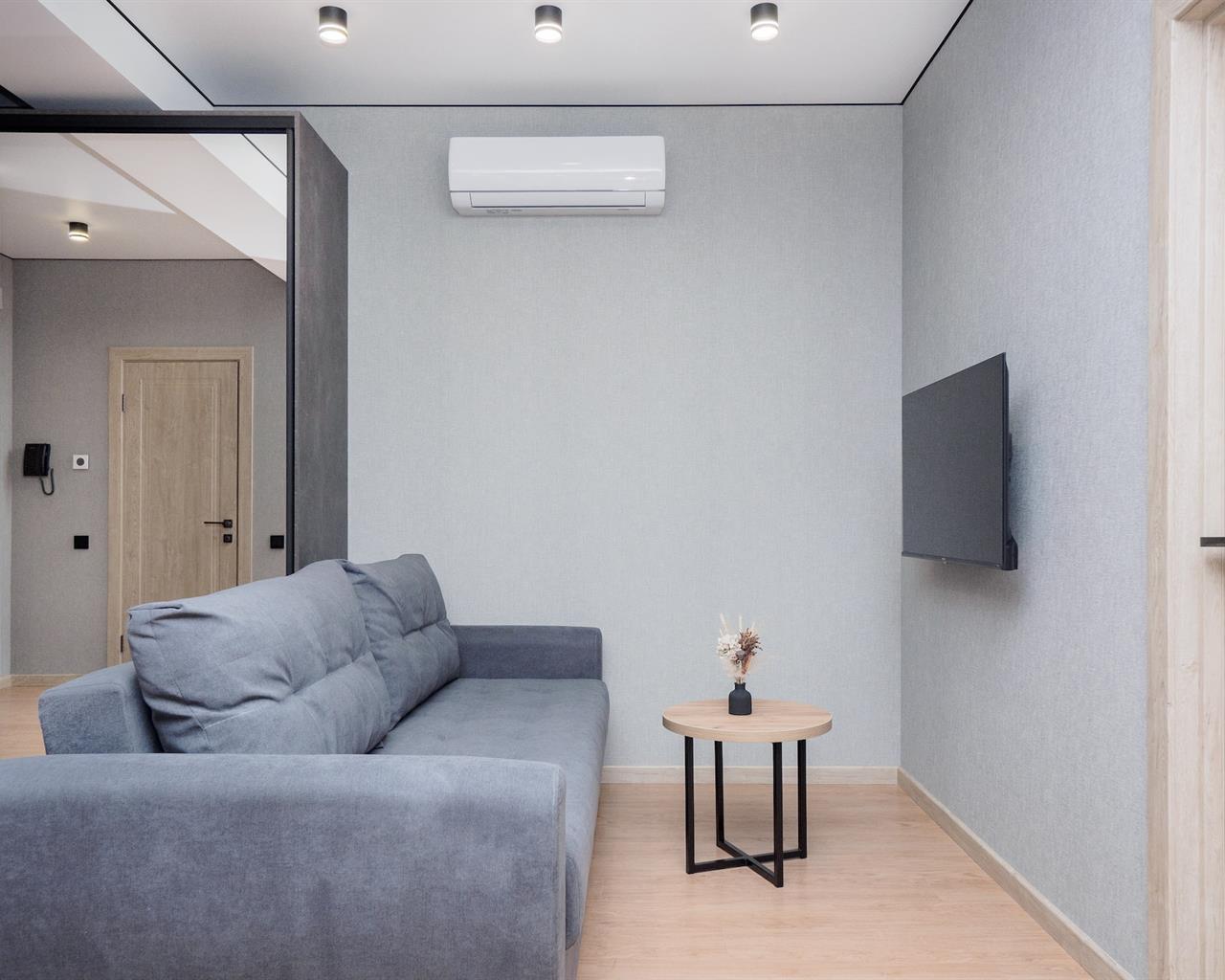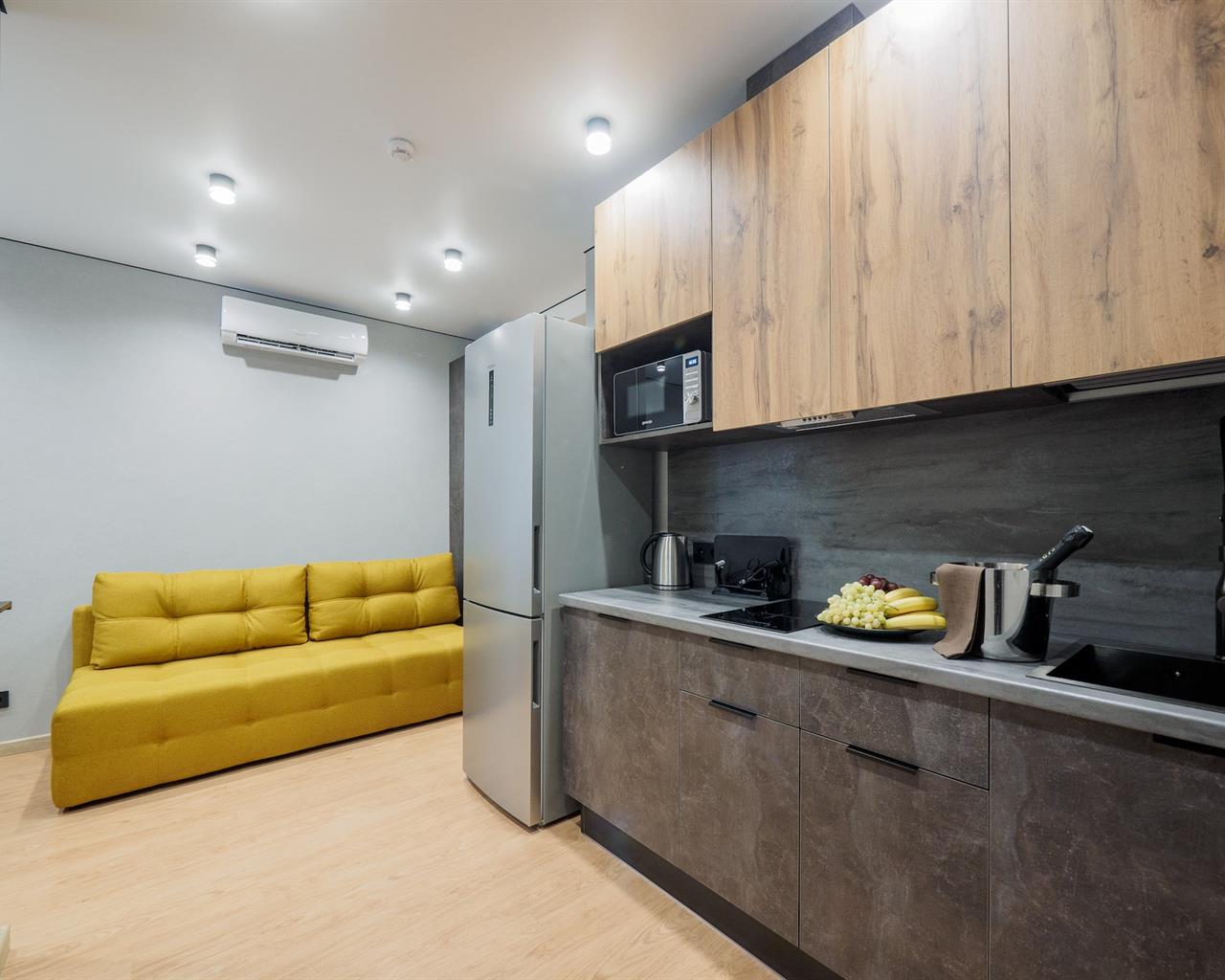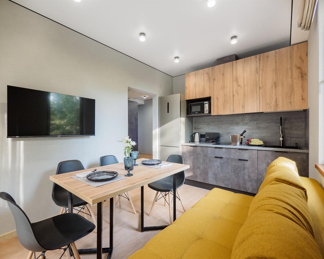 гладильная доска, микроволновая печь, набор посуды, плита электрическая, сейф, сплит-система, стиральная машина, сушилка для белья, телевизор ЖК, телефон, утюг, холодильник, электрочайник