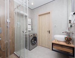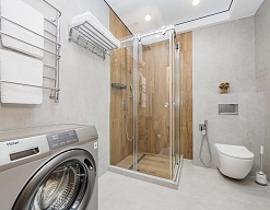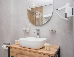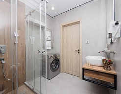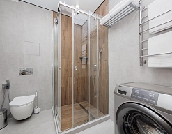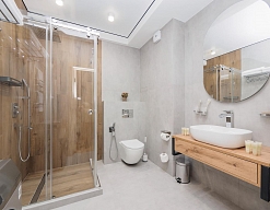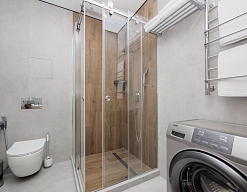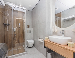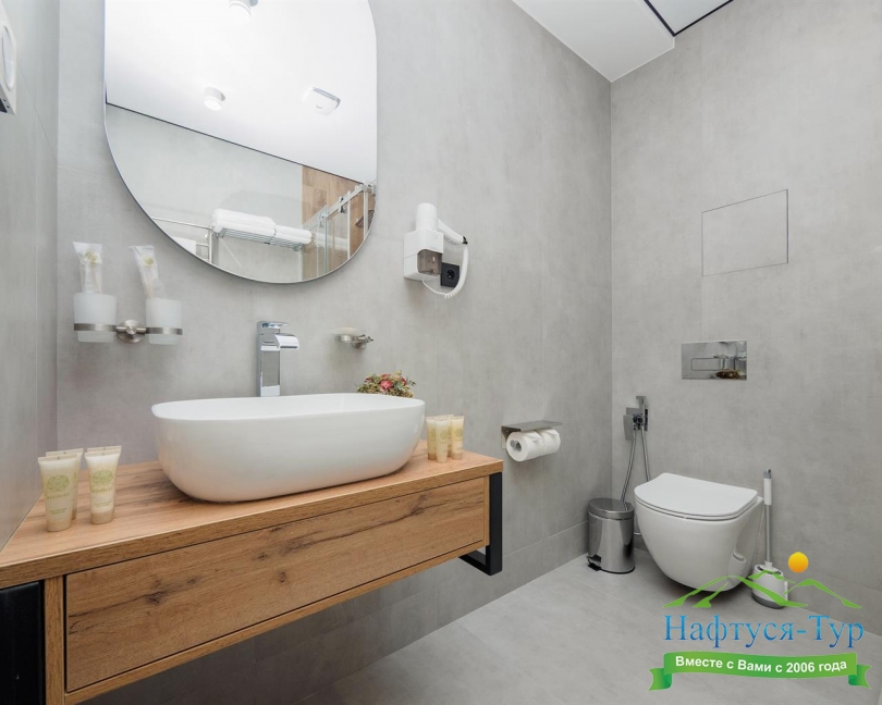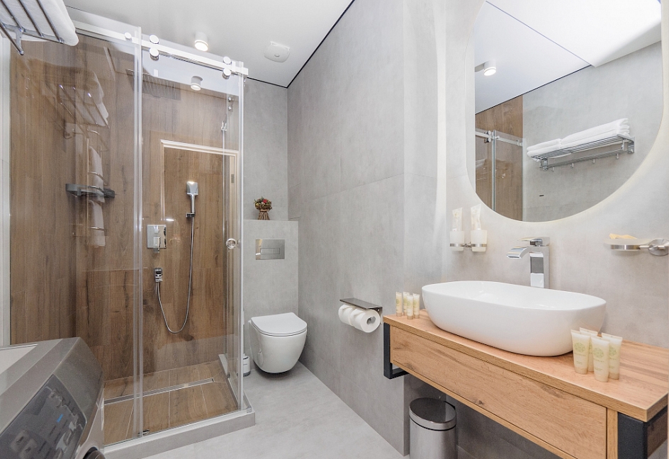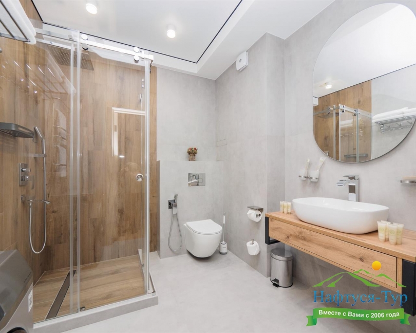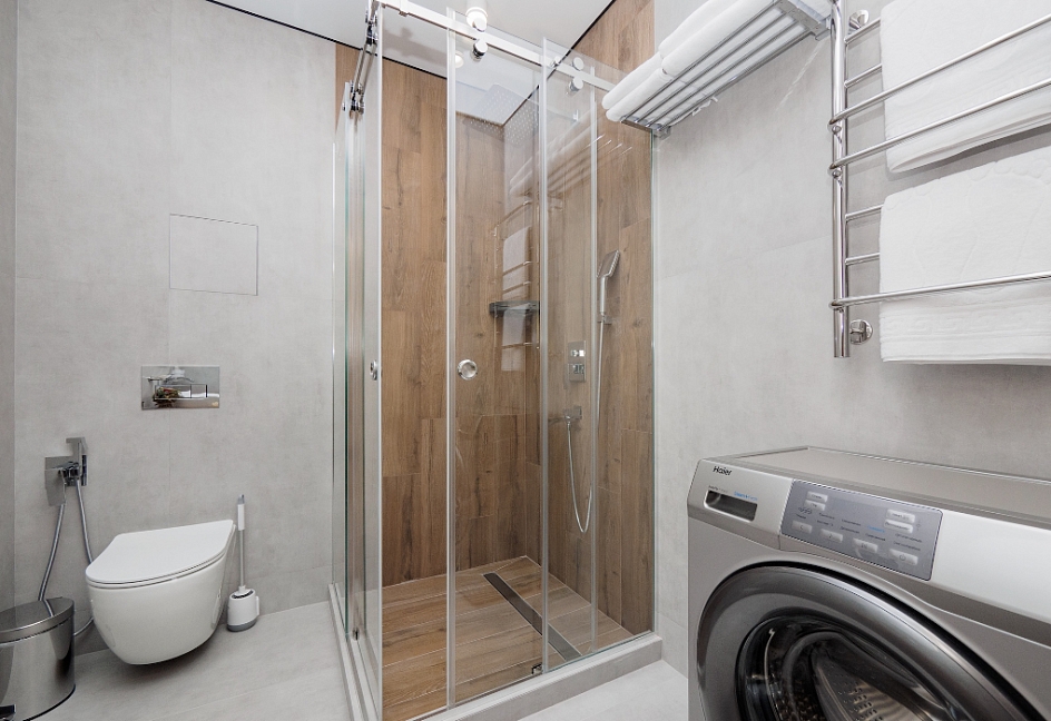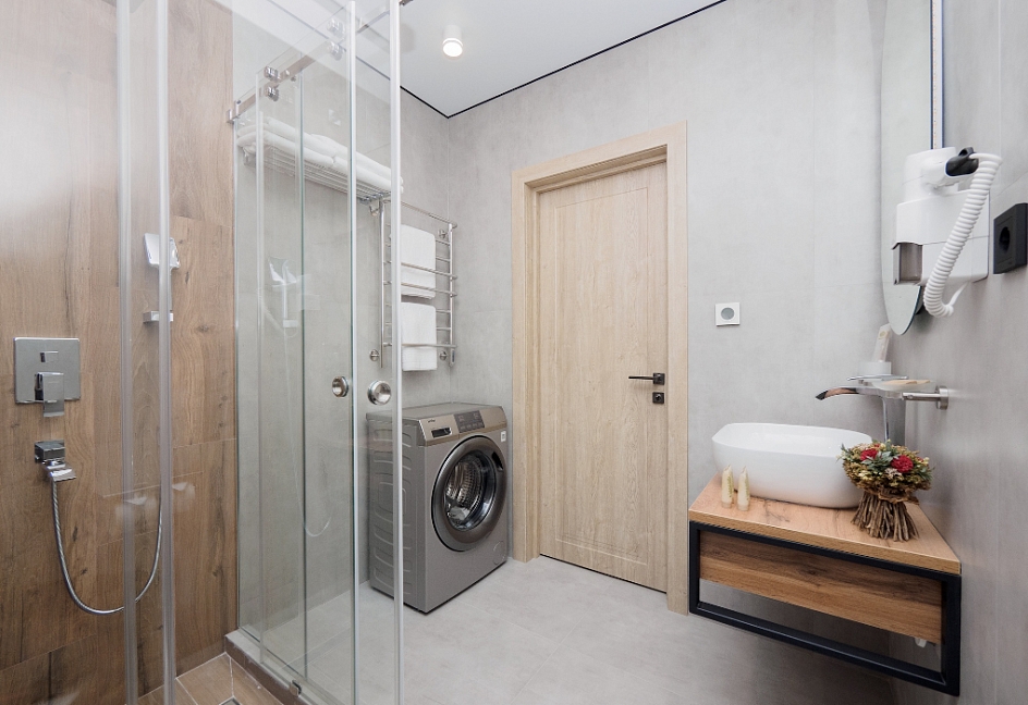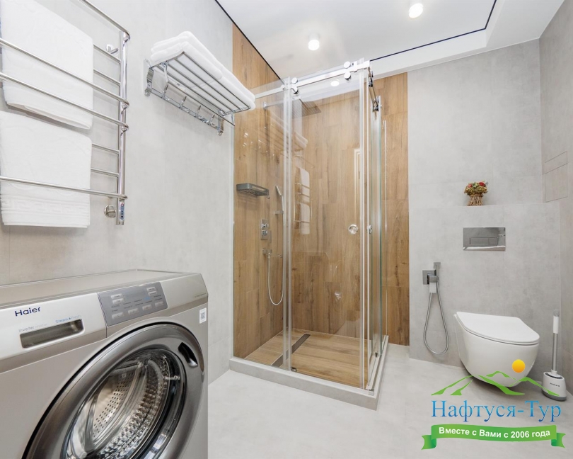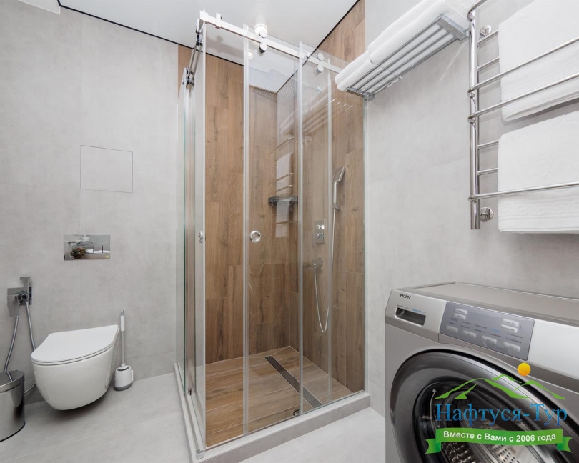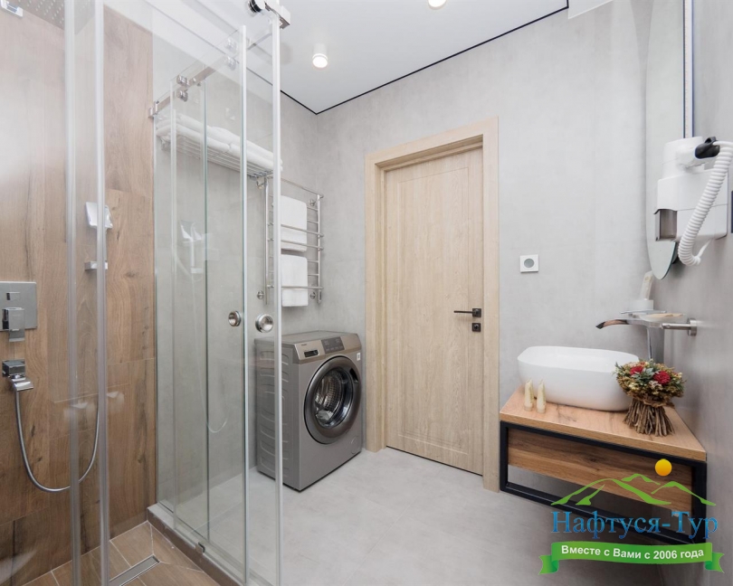 с душевой кабиной, тапочки, туалетные принадлежности, фен