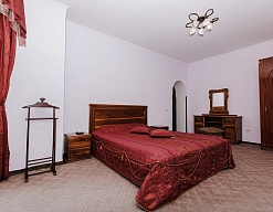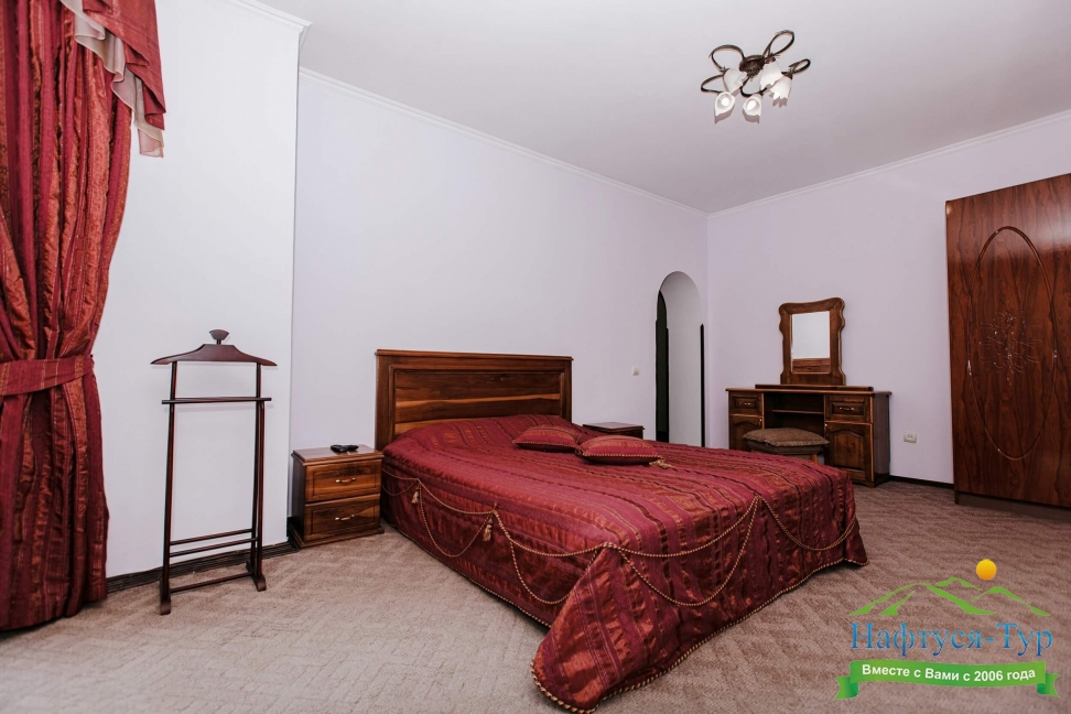зеркало, кровать двуспальная, прикроватные тумбочки, стол, стулья, тумба под телевизор, шкаф