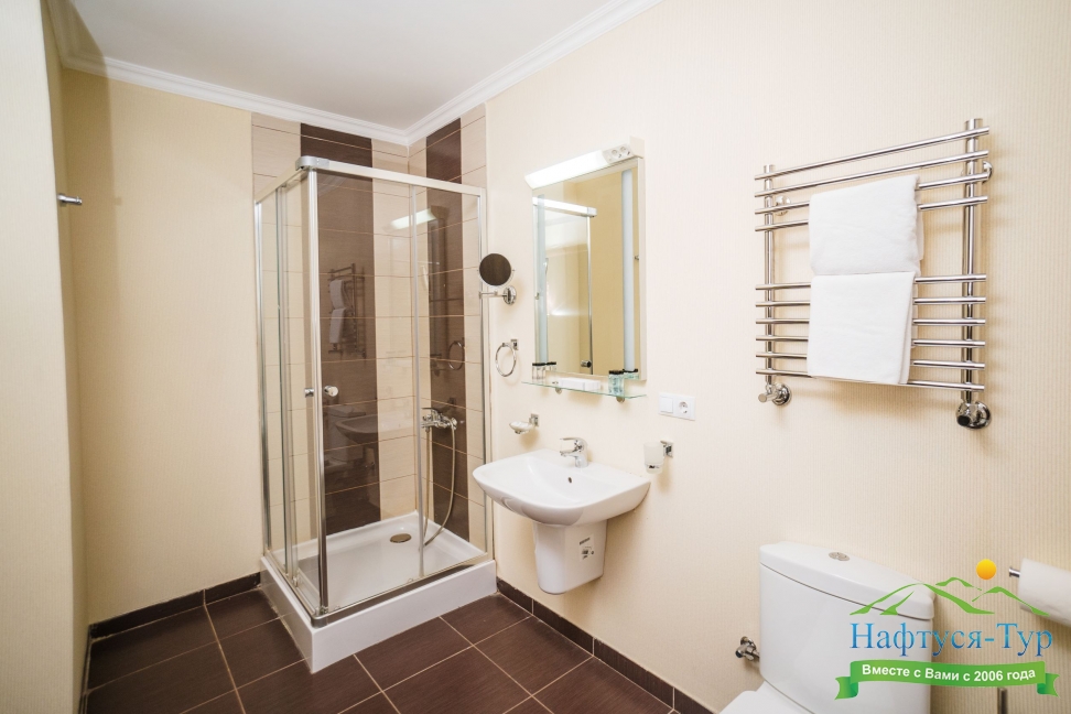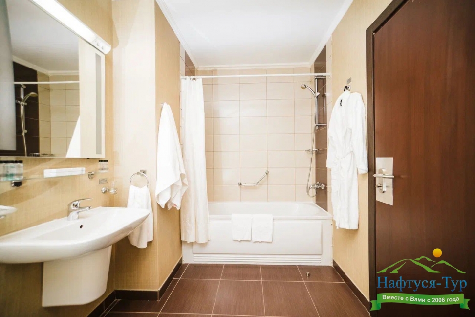с душем, тапочки, туалетные принадлежности, фен, халат