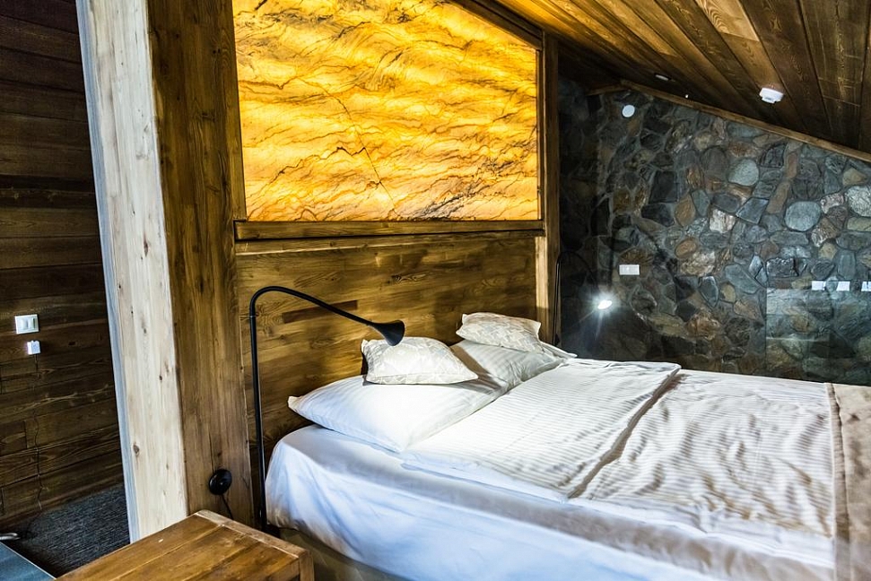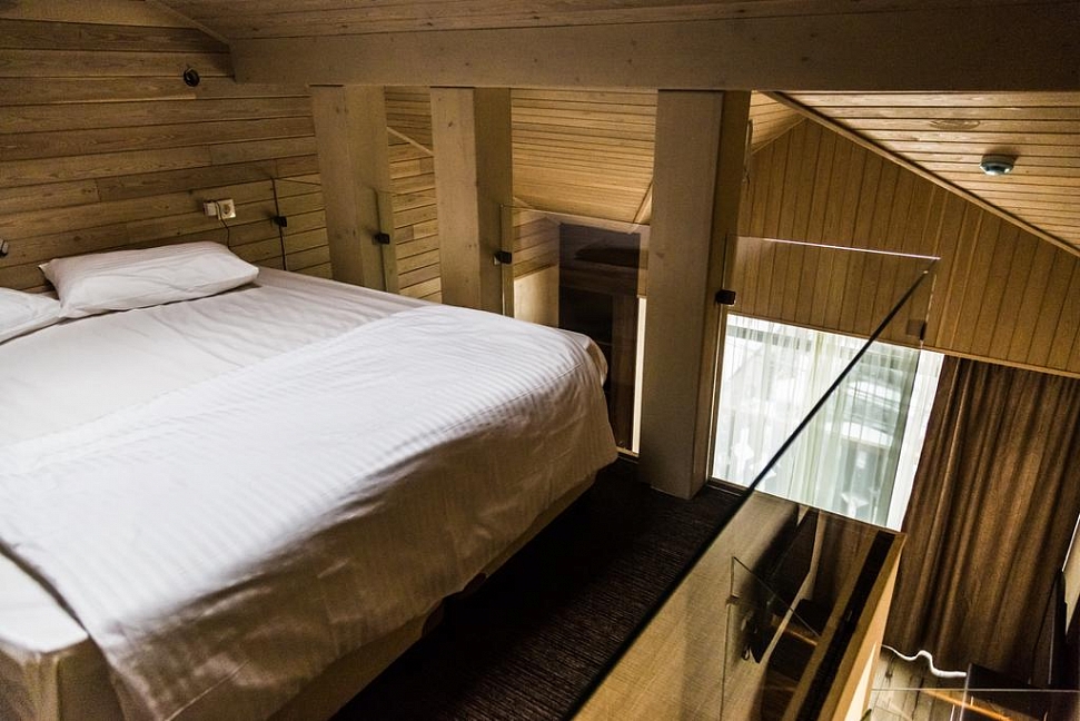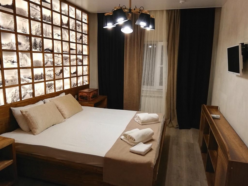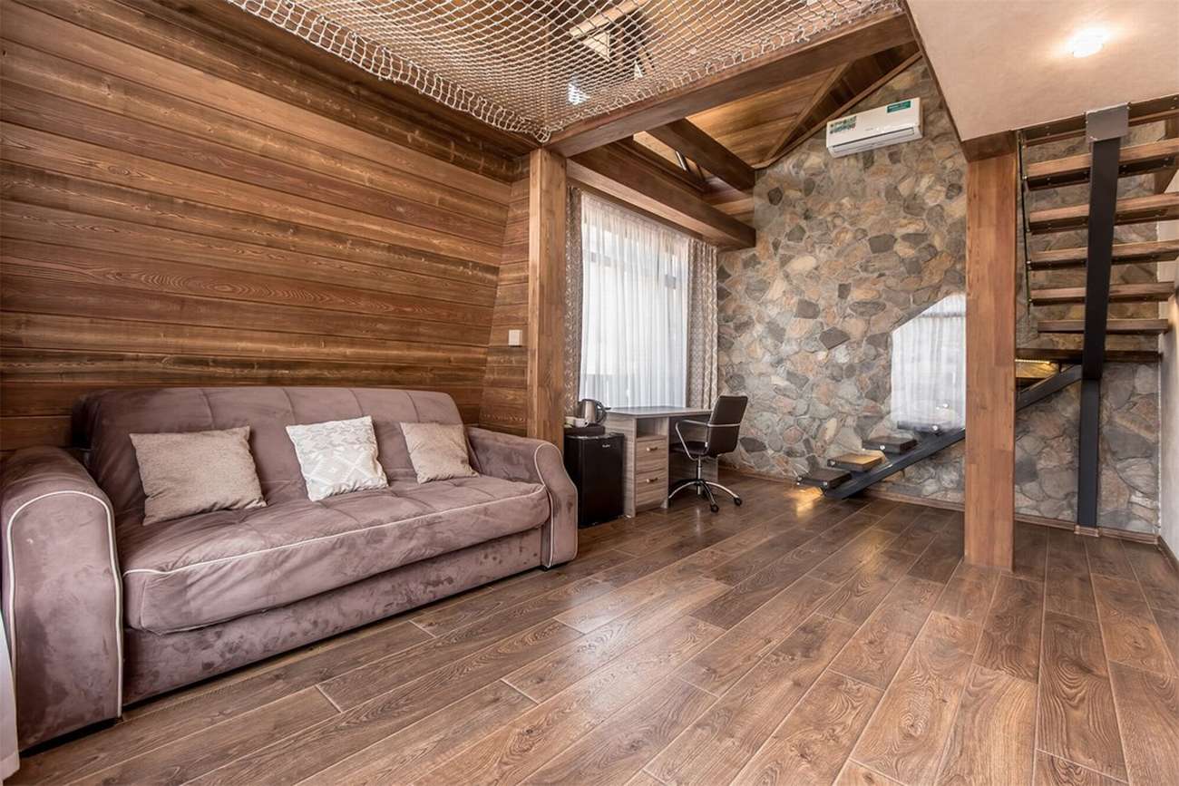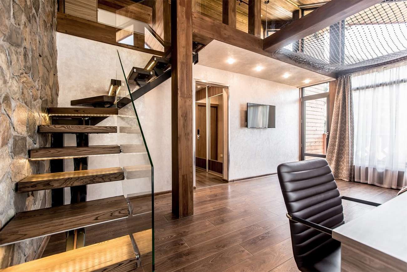 · Отличный номер ! Запах натурального дерева, чисто, отделка дикого камня, Лестницы и Шторы с подсветкой, перегородки из каленого стекла, даже перегородки лестниц, совместили шале и современный стиль.