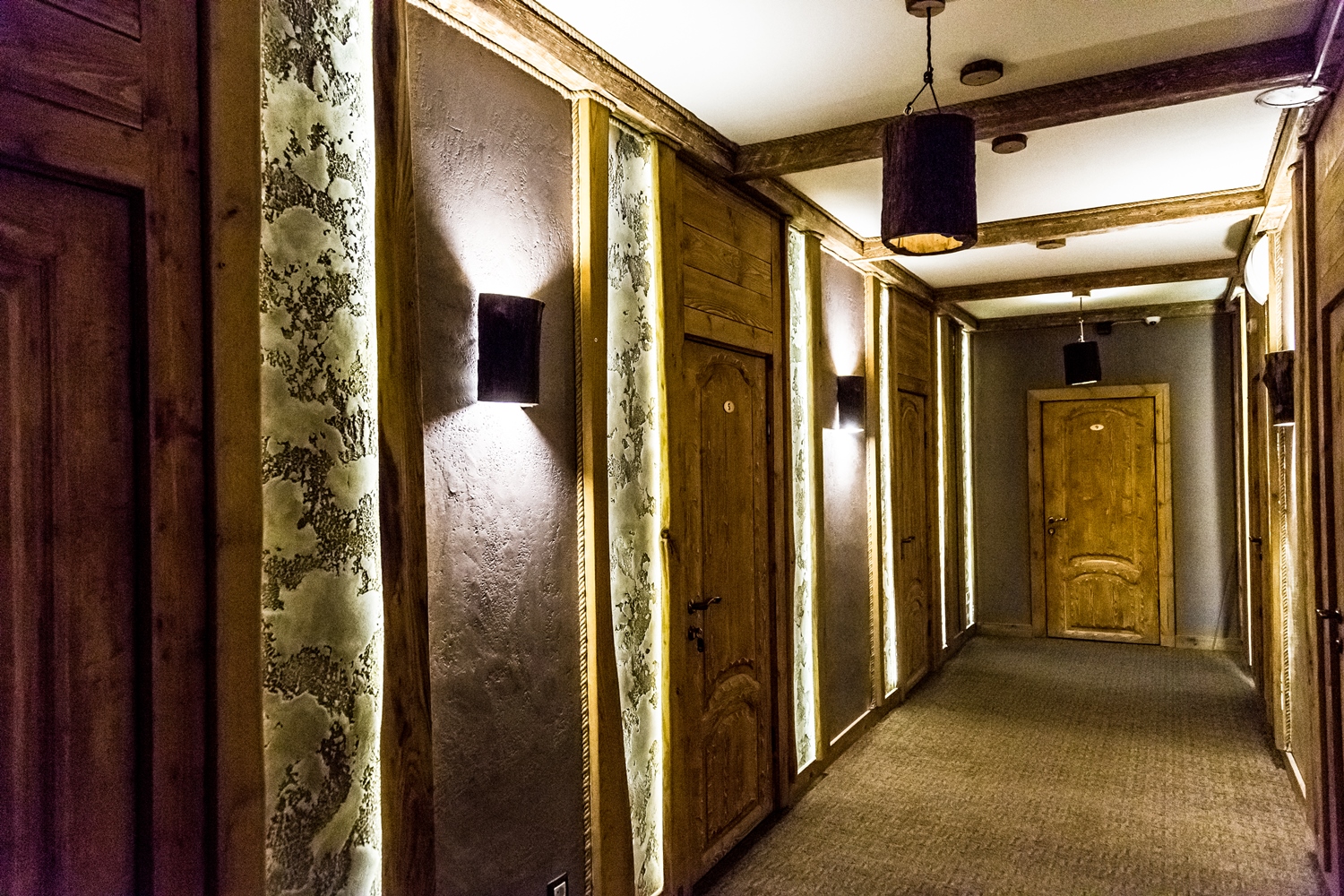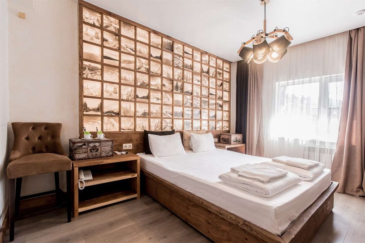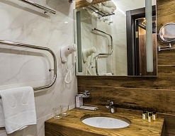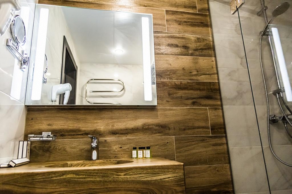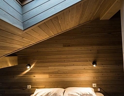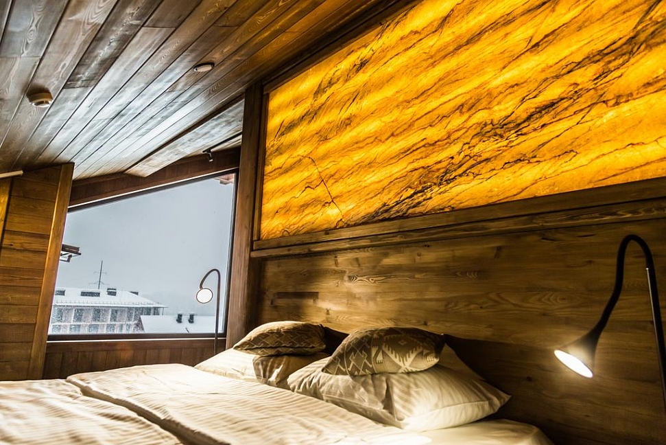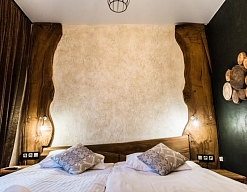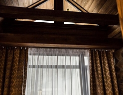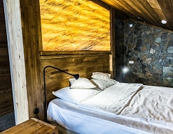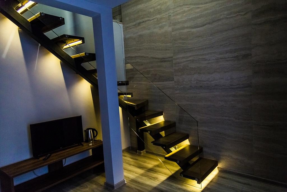· Отличный номер ! Запах натурального дерева, чисто, отделка дикого камня, Лестницы и Шторы с подсветкой, перегородки из каленого стекла, даже перегородки лестниц, совместили шале и современный стиль.