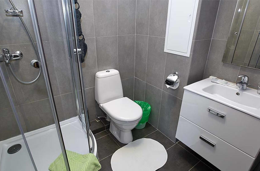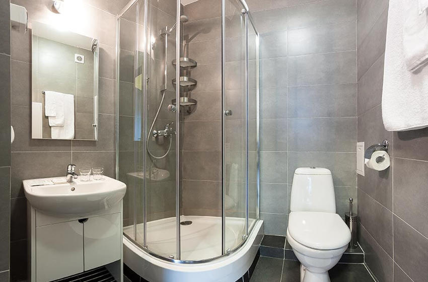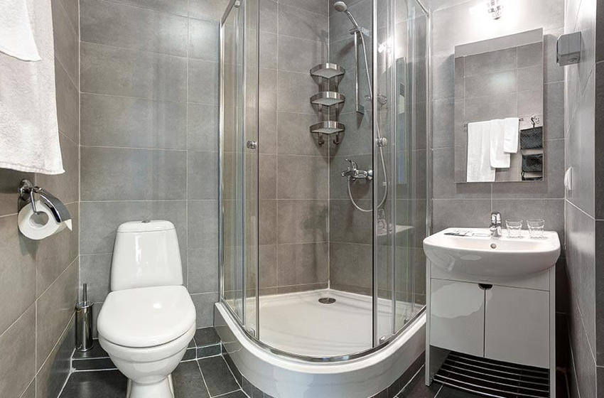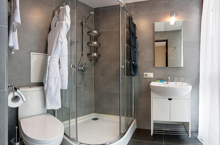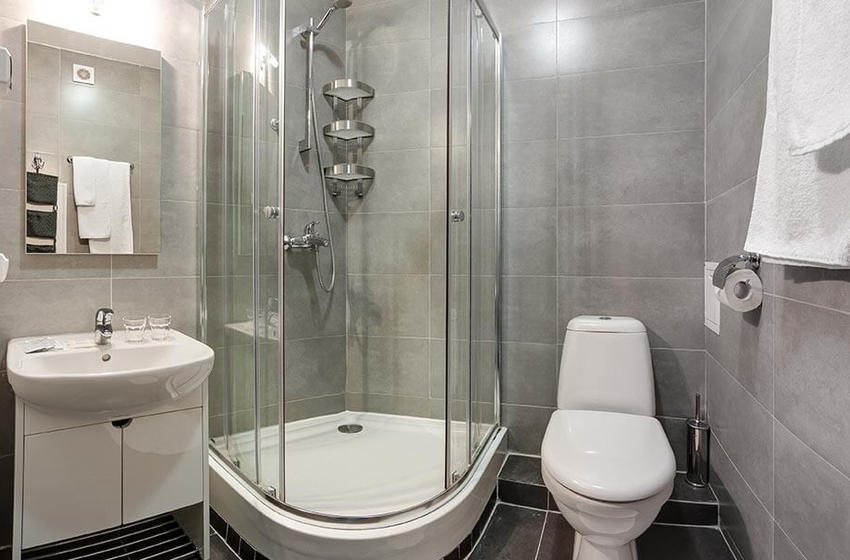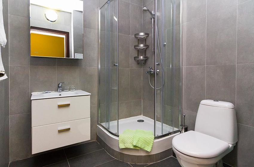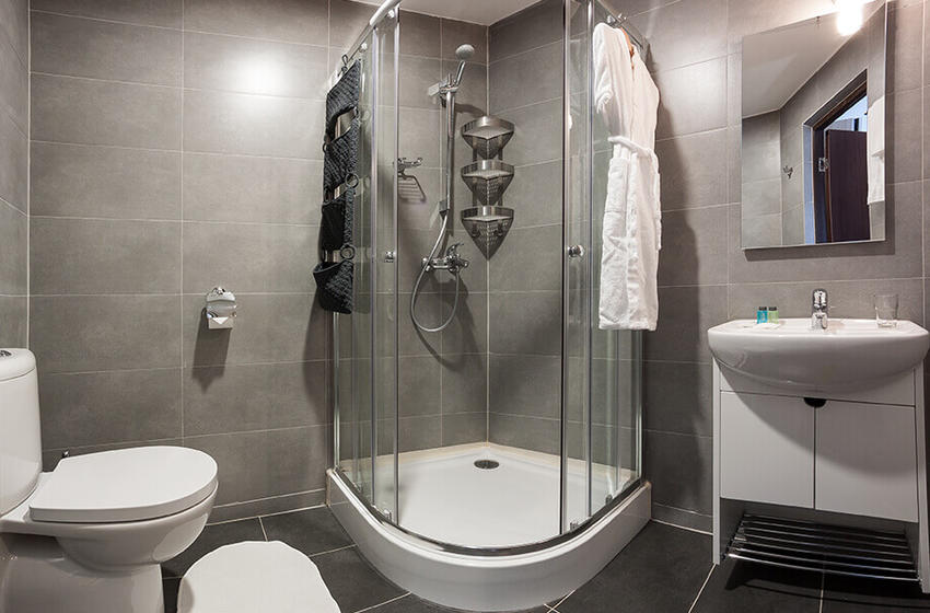 с душевой кабиной, туалетные принадлежности, фен