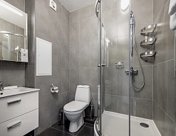 3 санузла, с душевой кабиной, тапочки, теплый пол, туалетные принадлежности, фен, халат