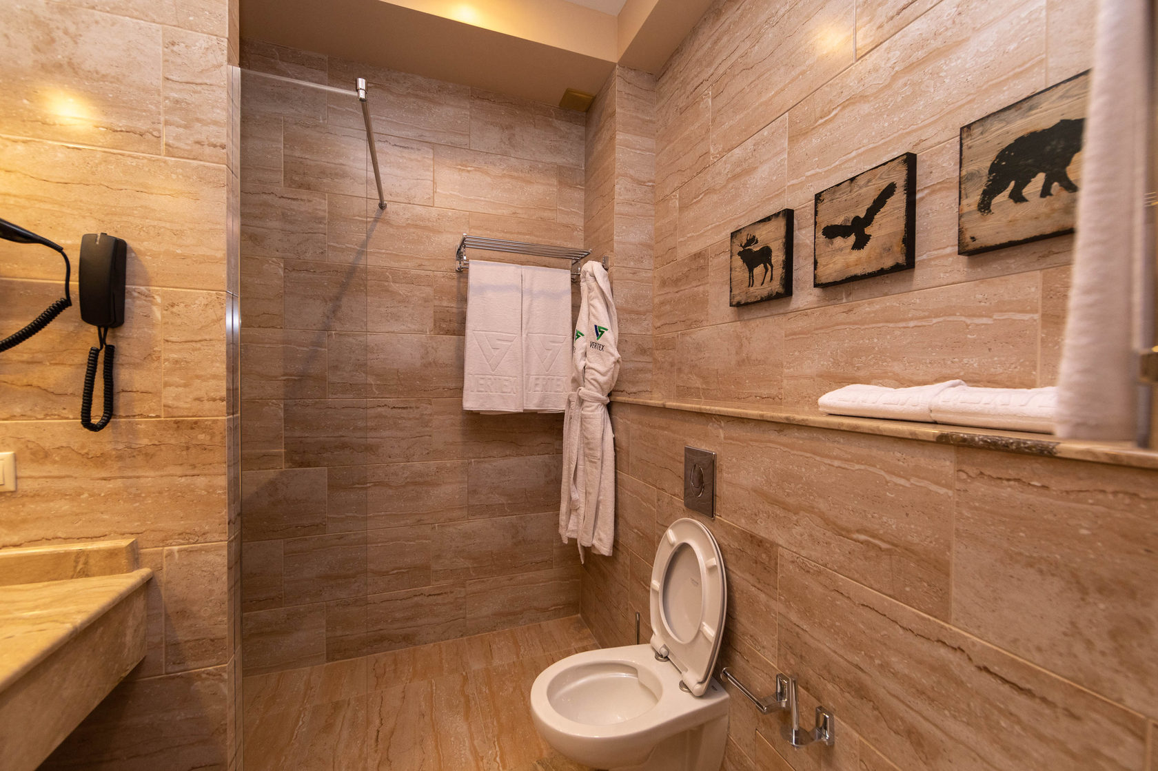 с душем , тапочки , туалетные принадлежности , фен , халат