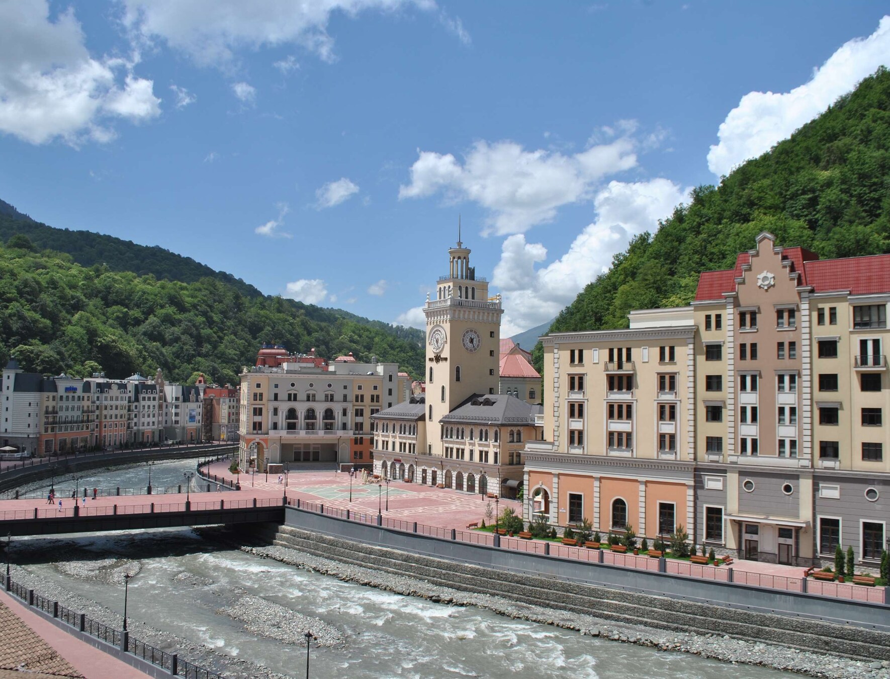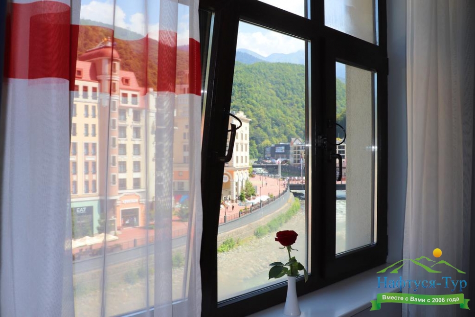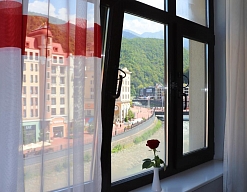 - расположен в самом сердце курорта «Роза Хутор», в 20 метрах от канатной дороги «Олимпия»