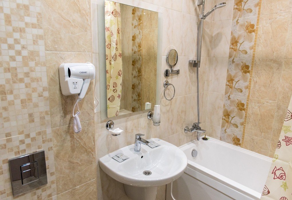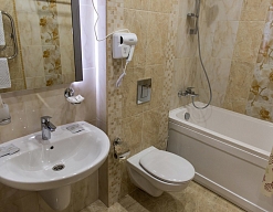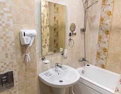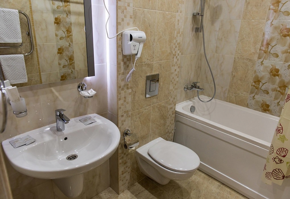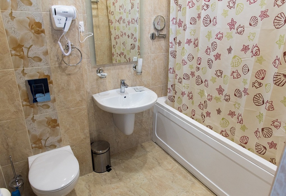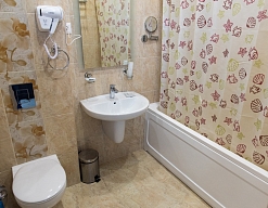 с ванной, тапочки, туалетные принадлежности, фен, халат