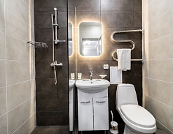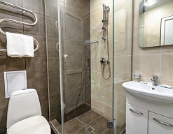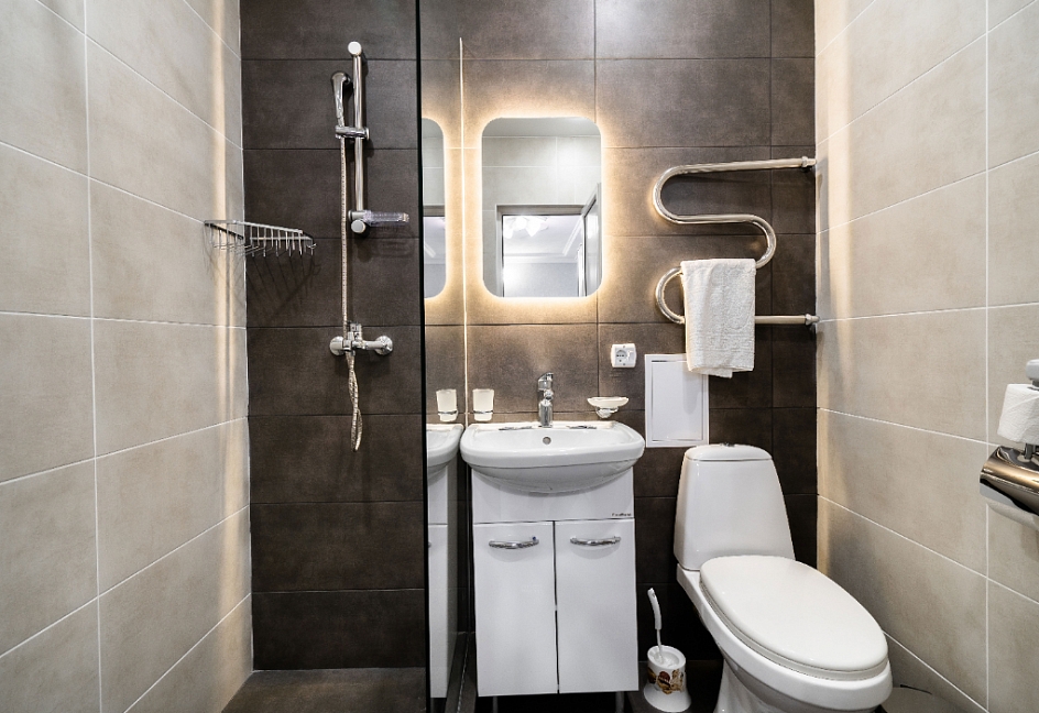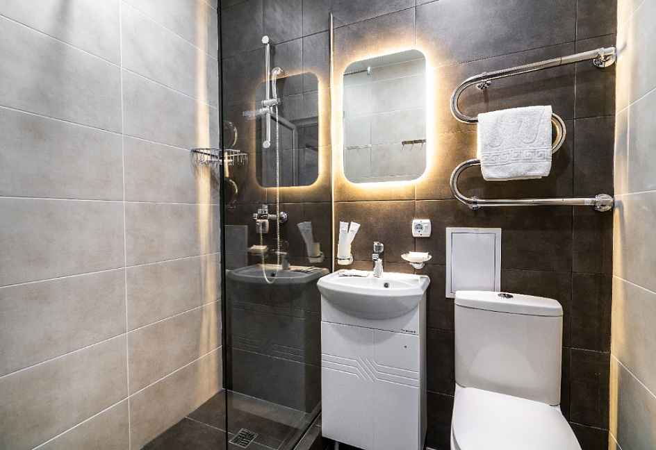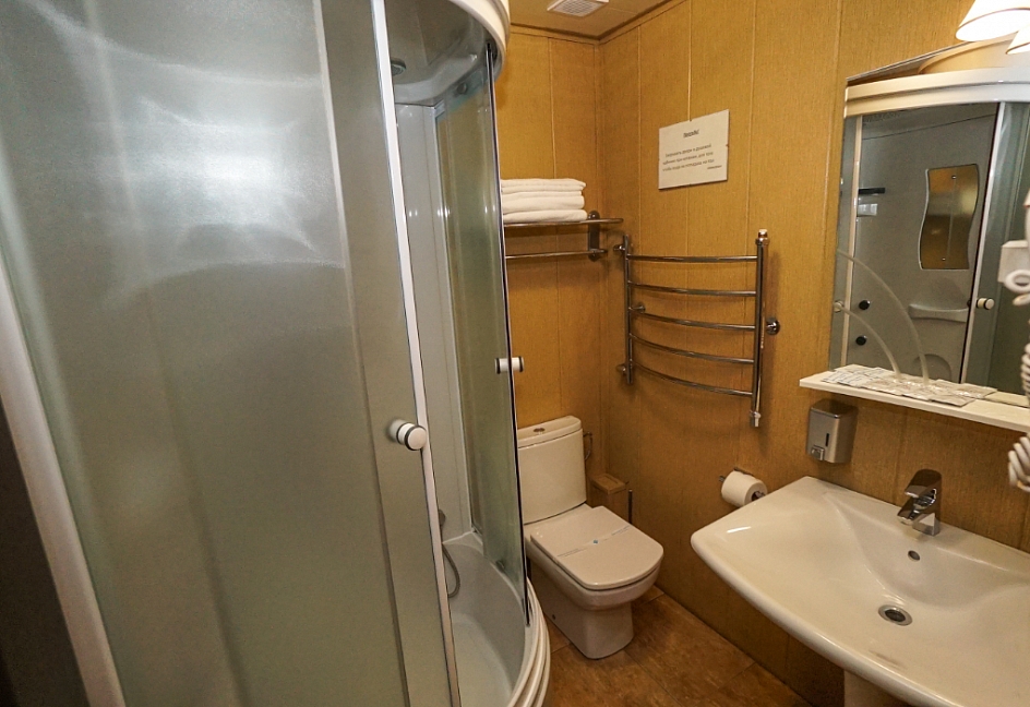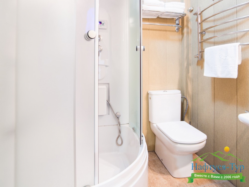 с душевой кабиной, тапочки, туалетные принадлежности, фен