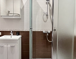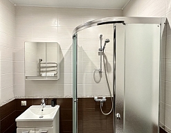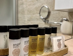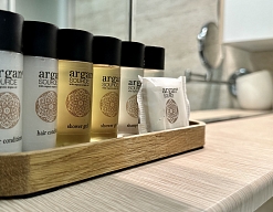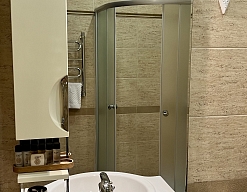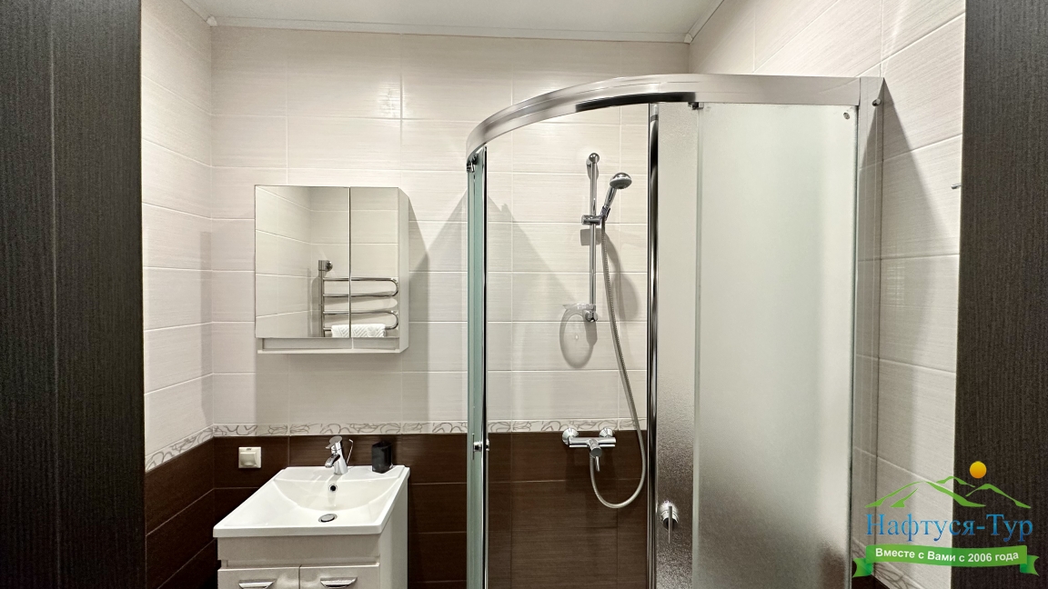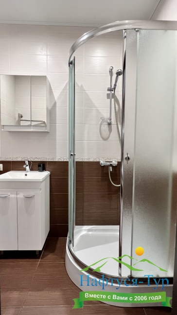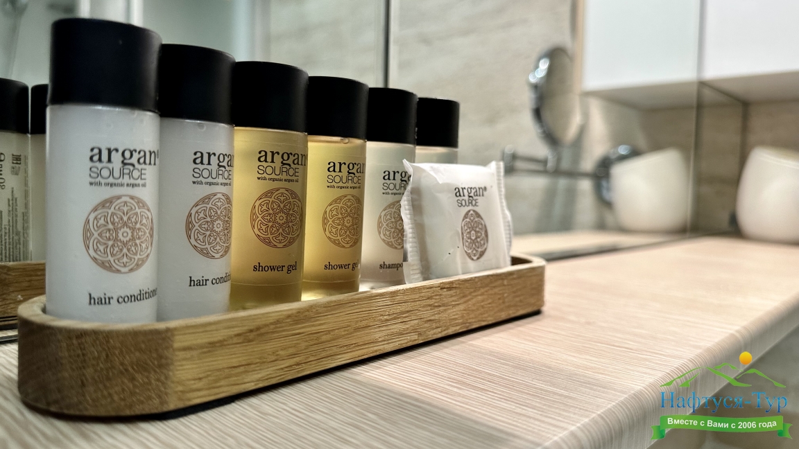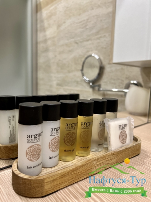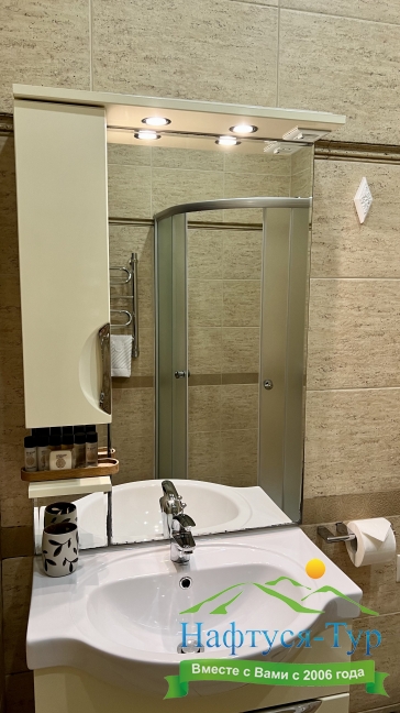 с душем, тапочки, туалетные принадлежности, фен, халат