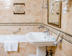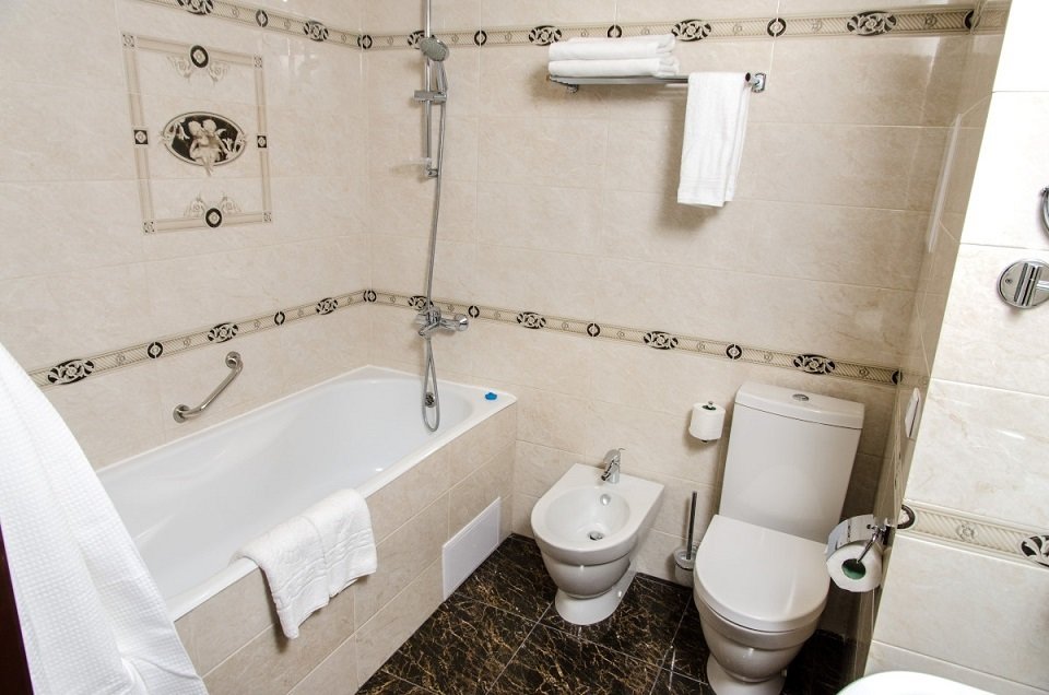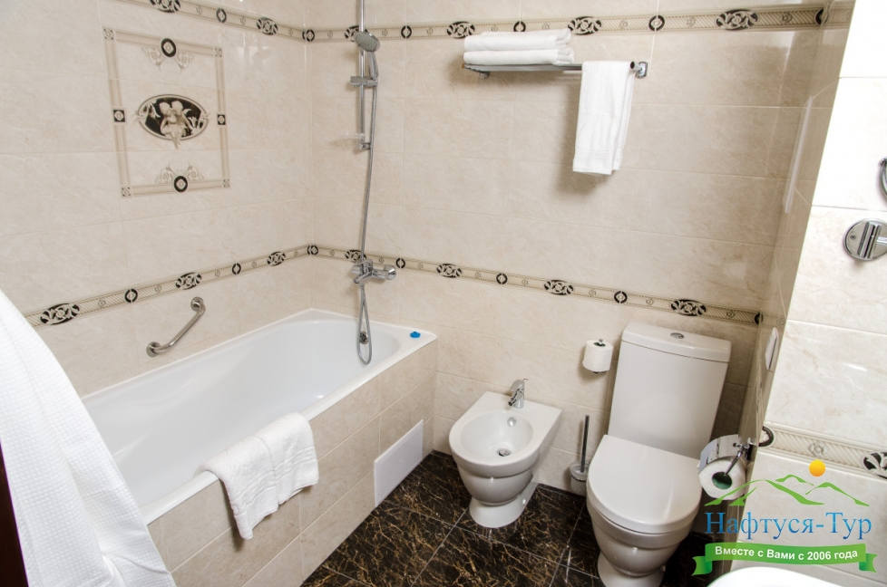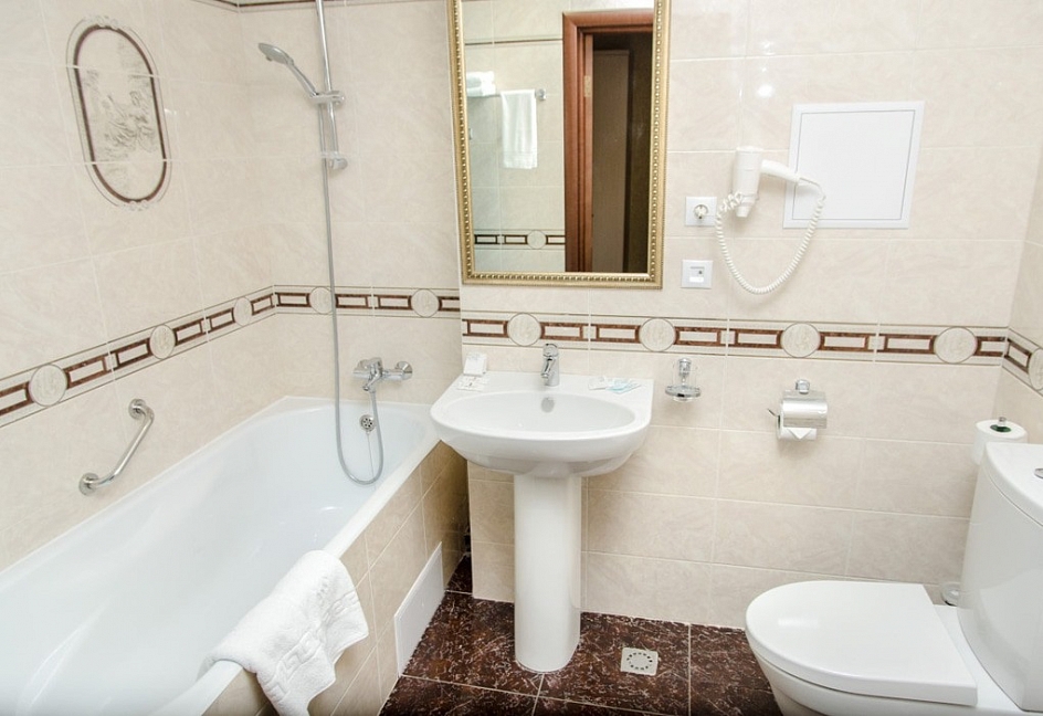с ванной, с душем, тапочки, туалетные принадлежности, фен, халат