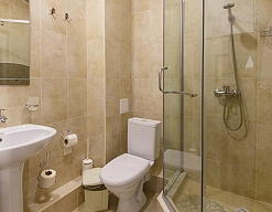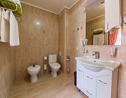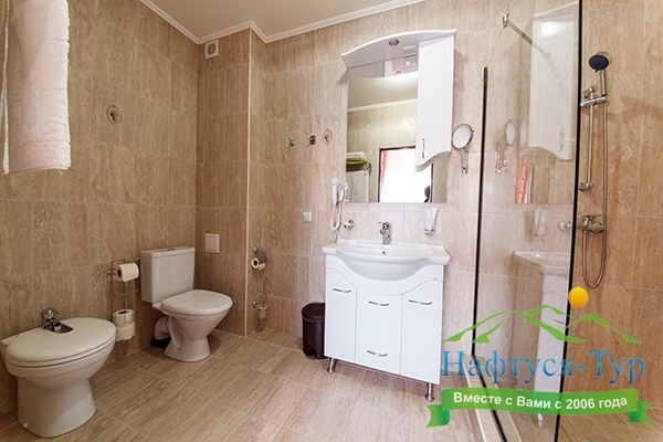 с душевой кабиной, тапочки, туалетные принадлежности, фен, халат