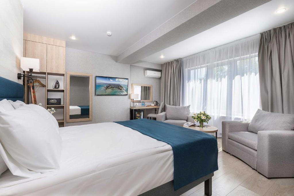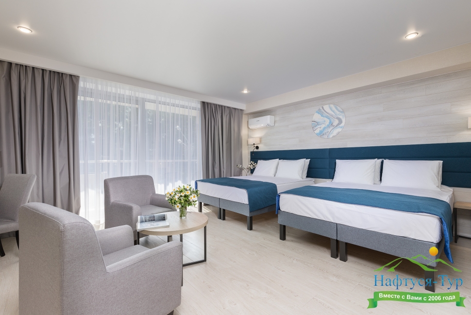 Самолетом до аэропорта г. Анапа, далее на маршрутном такси №113 до остановки «Дельфинарий», далее пройти пешком 530 м до отеля.