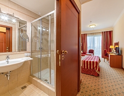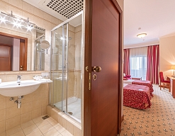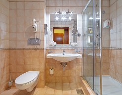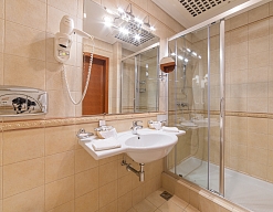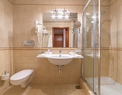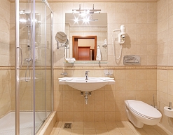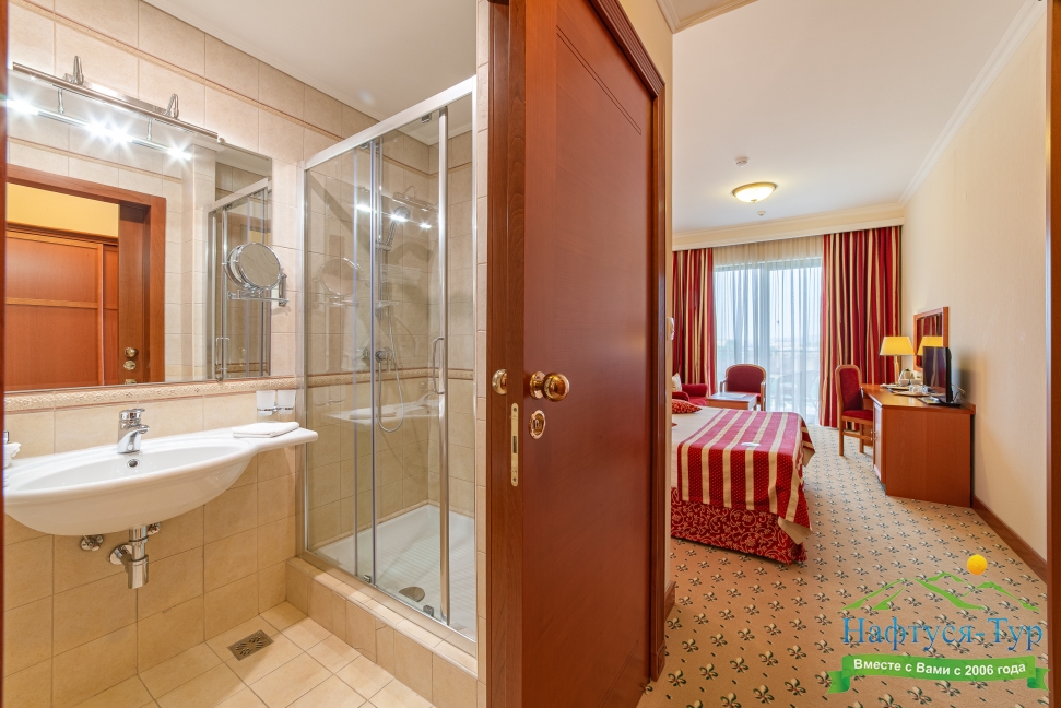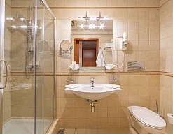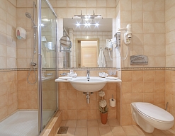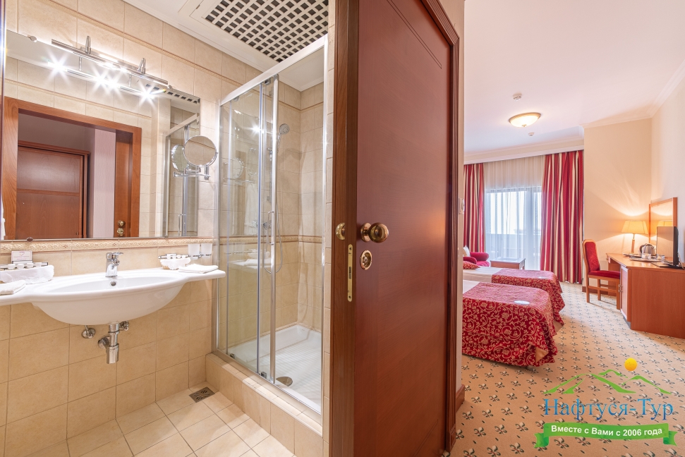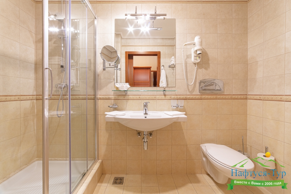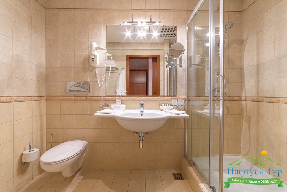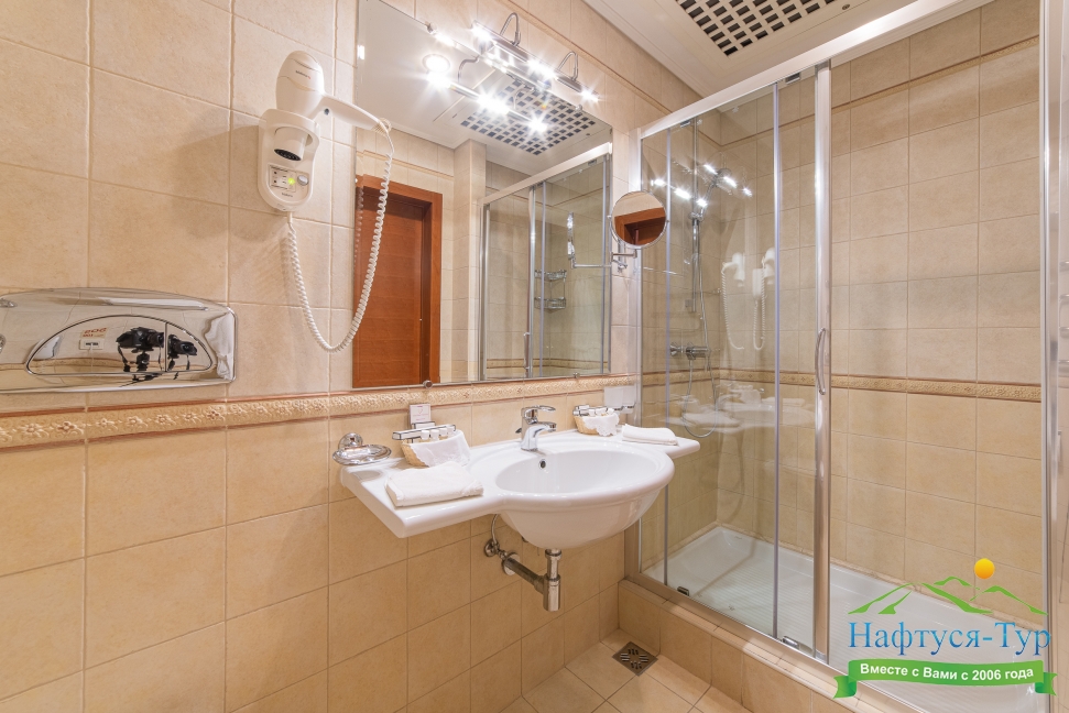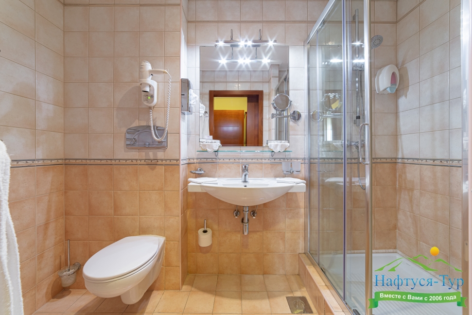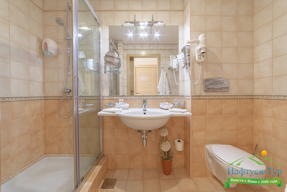 с душем, тапочки, туалетные принадлежности, фен, халат