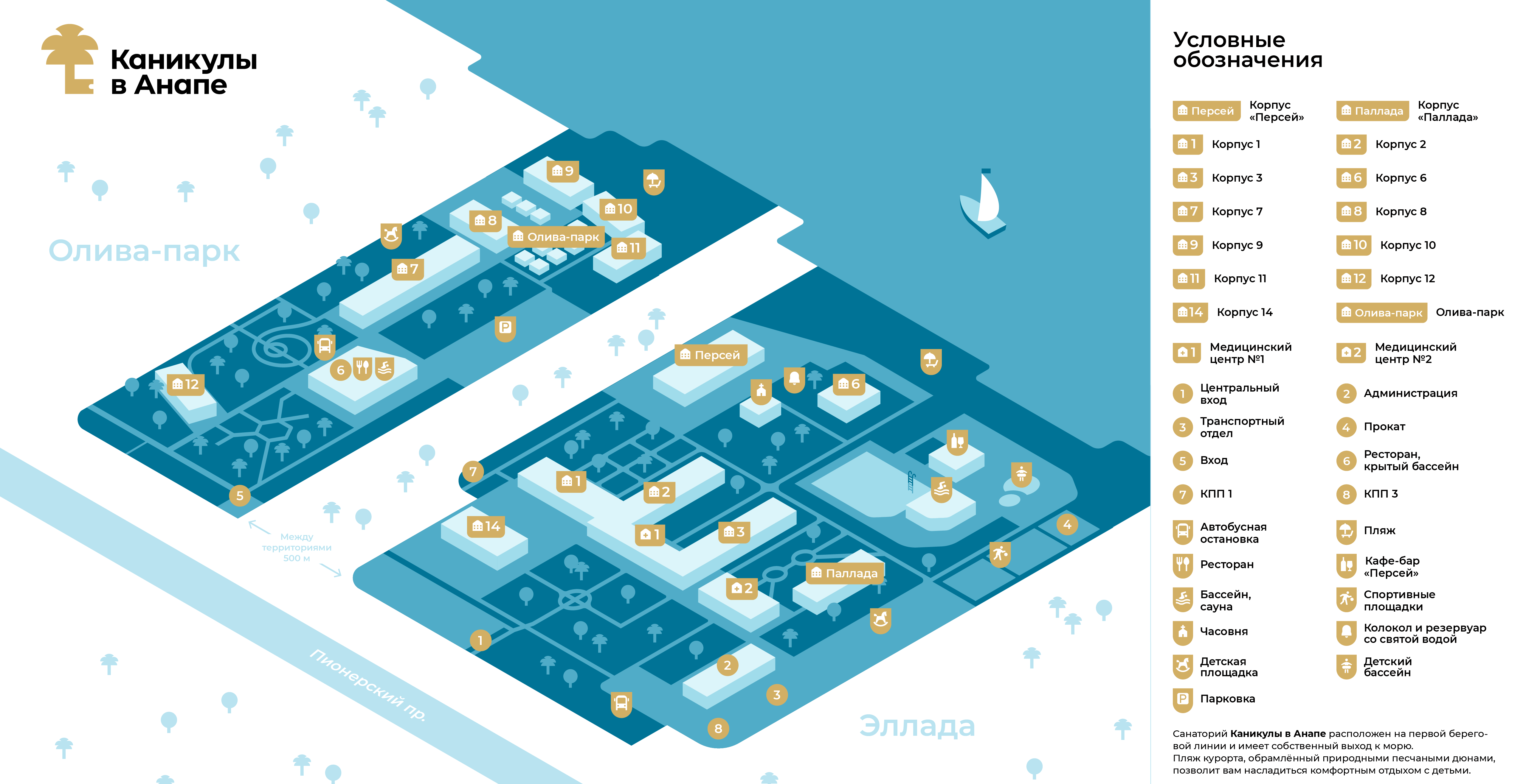 - огромный собственный пляж курорта оборудован всем необходимым для комфортного отдыха наших гостей