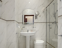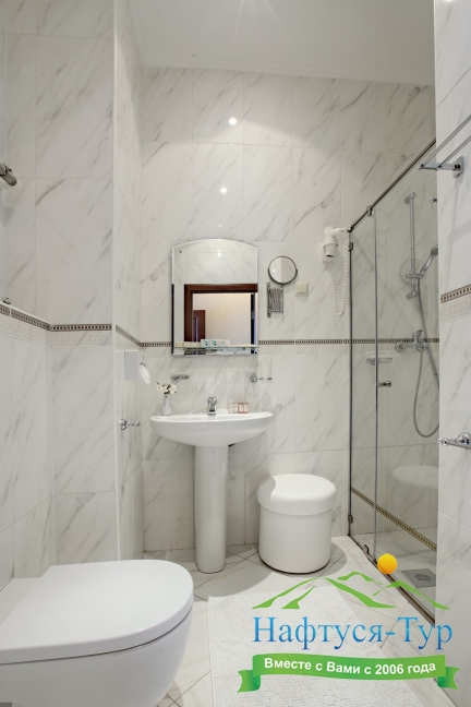 с душем (поддон), тапочки, туалетные принадлежности, фен, халат