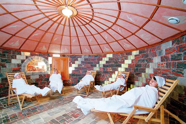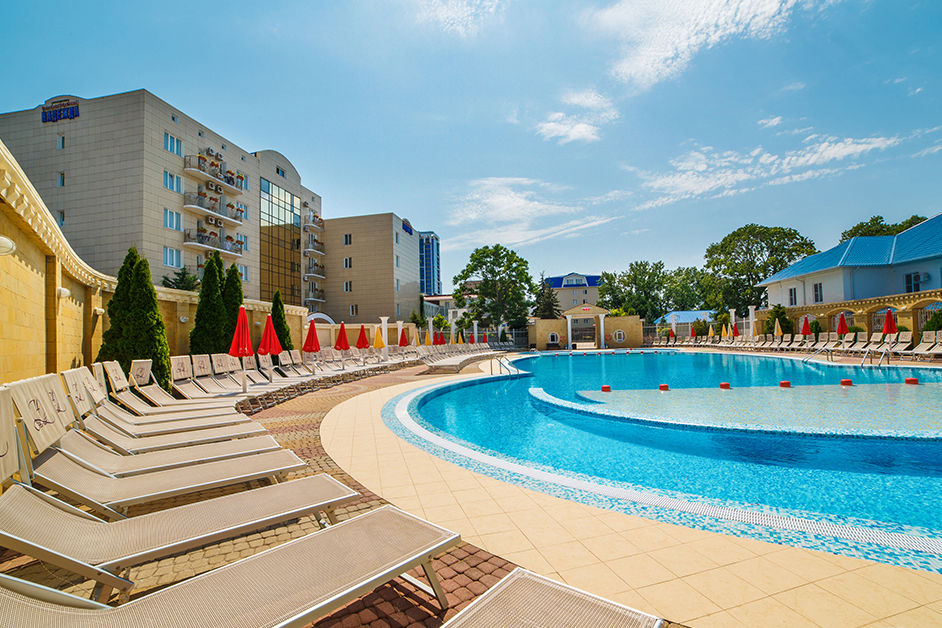 открытый подогреваемый бассейн с зеркалом воды 750 кв.м. с морской водой, сухая финская сауна, русская парная с веничком, турецкий хамам, кедровые бочки, бассейн при сауне, три бассейна-джакузи при новом термокомплексе, инфракрасная сауна, солярий.