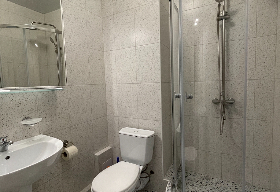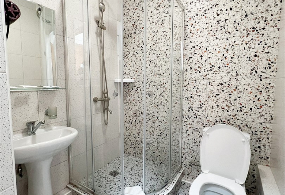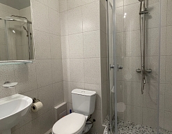 с душевой кабиной, туалетные принадлежности, фен