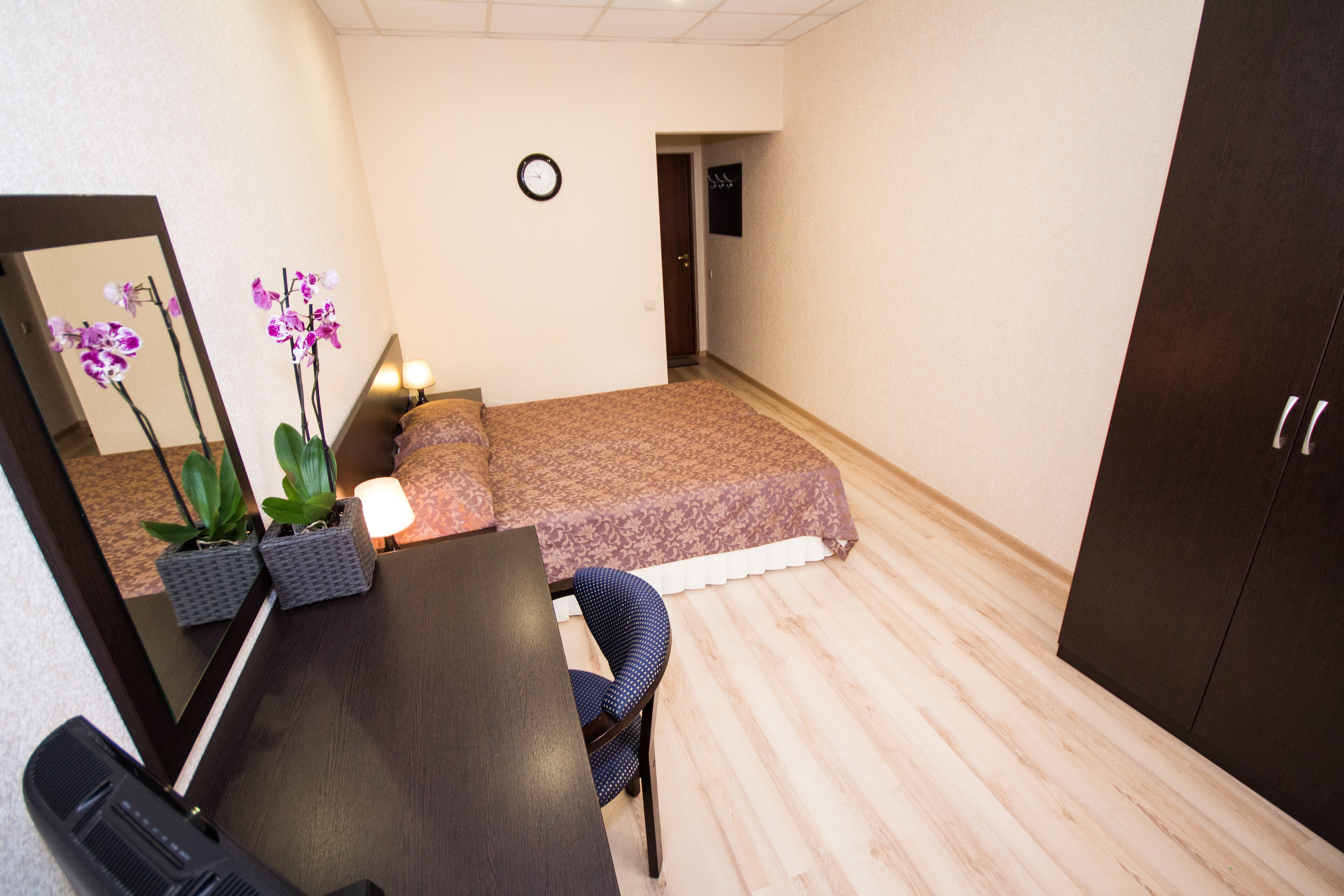 вешалка, зеркало, кровати односпальные /одна двуспальная кровать, прикроватные тумбочки, стол, стулья, шкаф