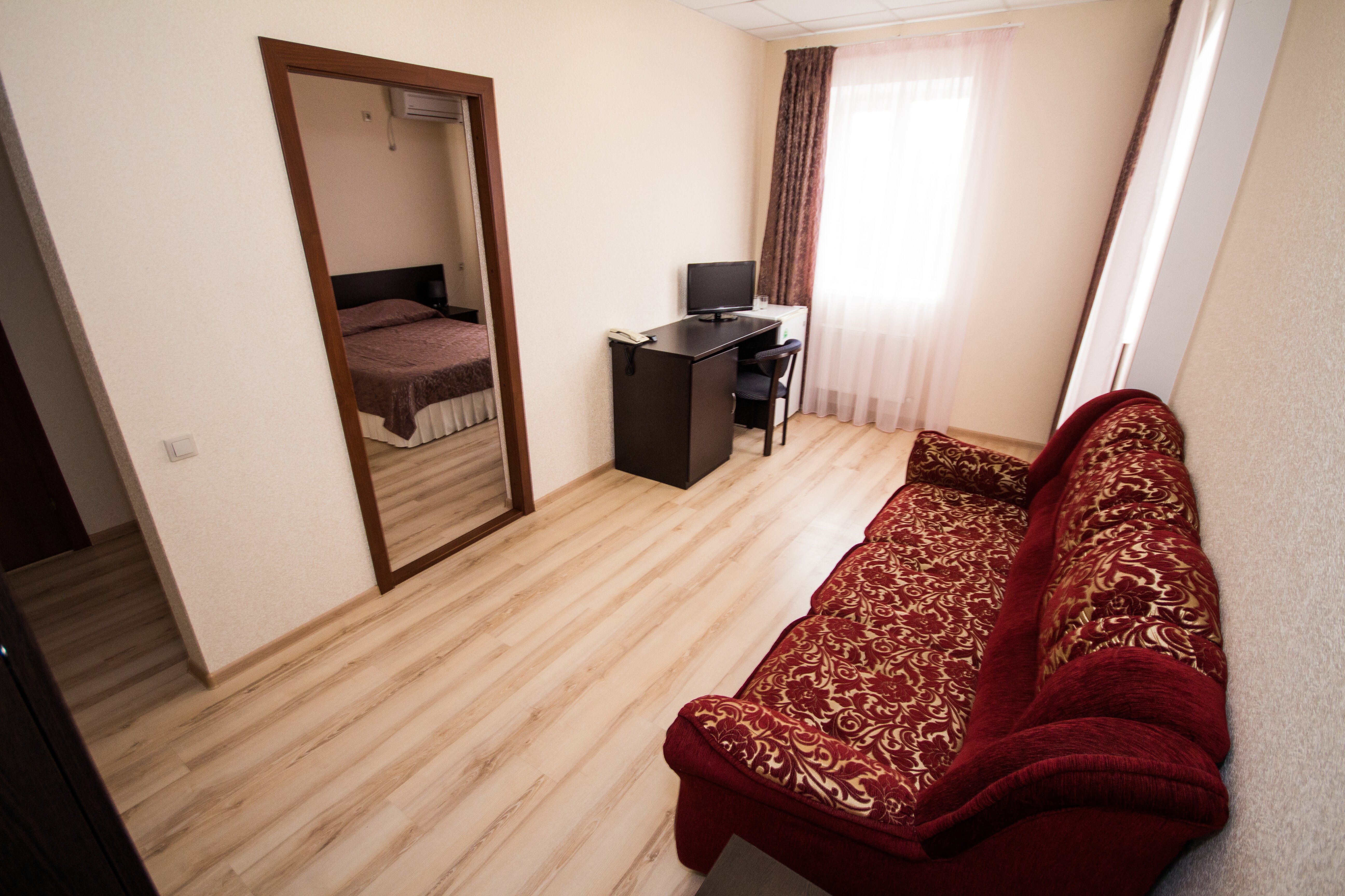 вешалка, диван раскладной, зеркало, кровать двуспальная, прикроватные тумбочки, стол, столик туалетный, стул, тумба багажная, шкаф