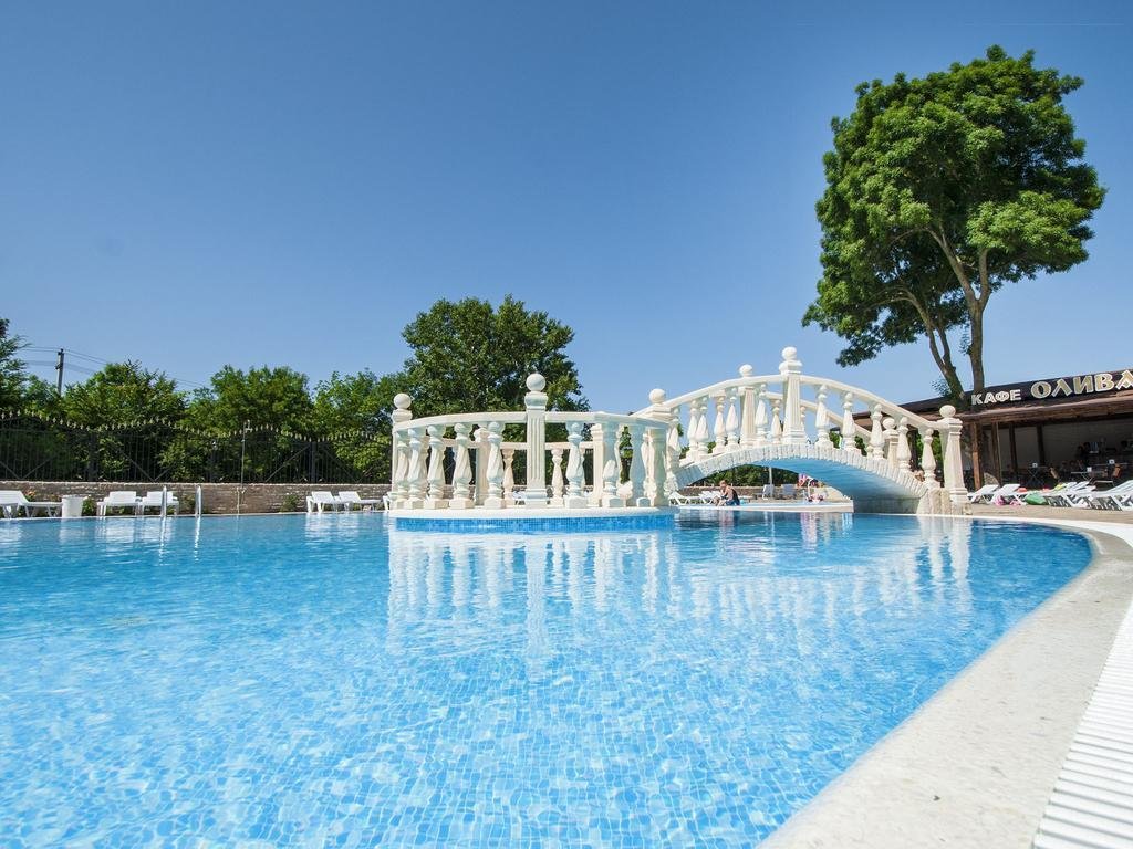 Просторный открытый бассейн оборудован декорированным мостиком, шезлонгами и зонтиками. Вода пресная, размер 20х10, шезлонги.