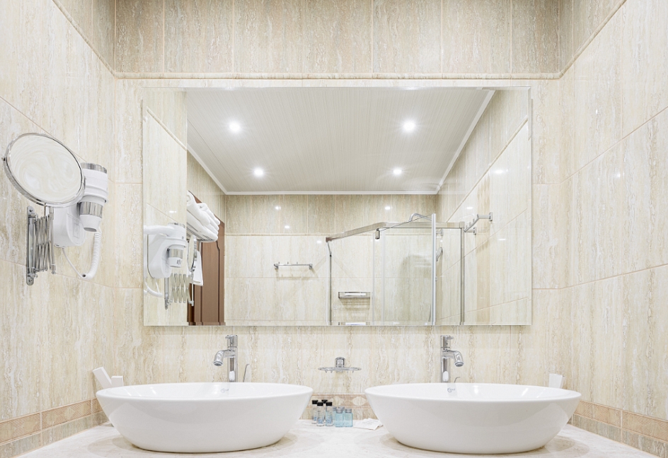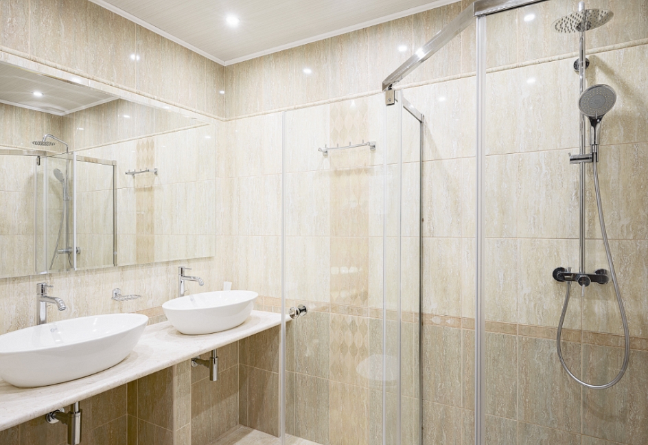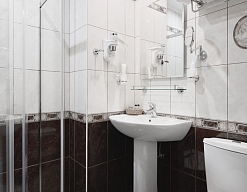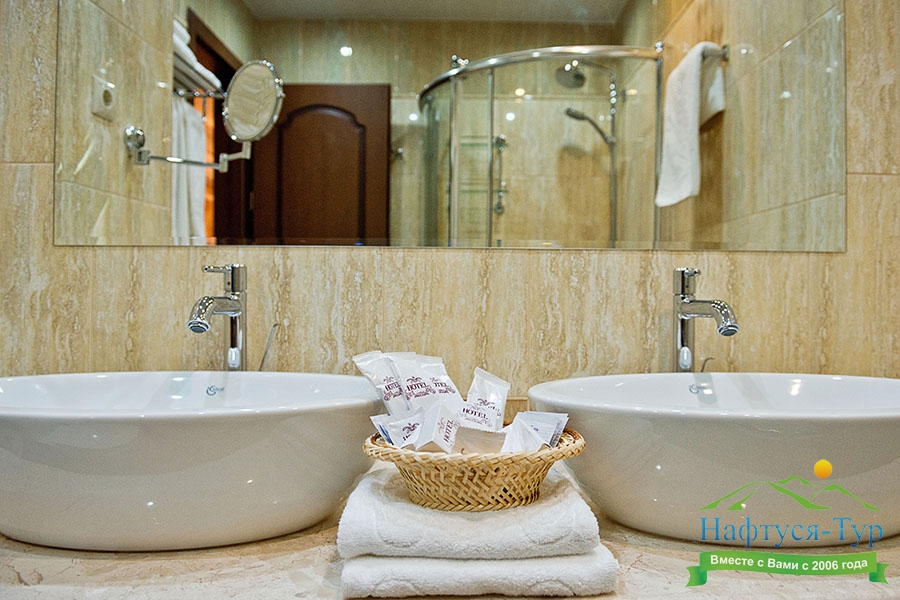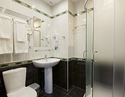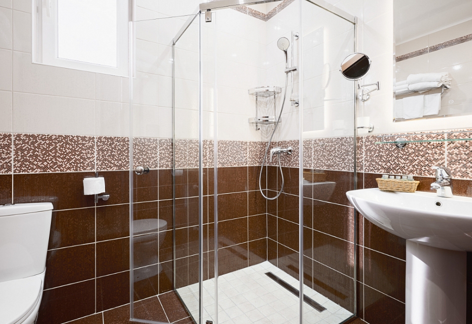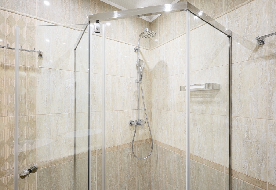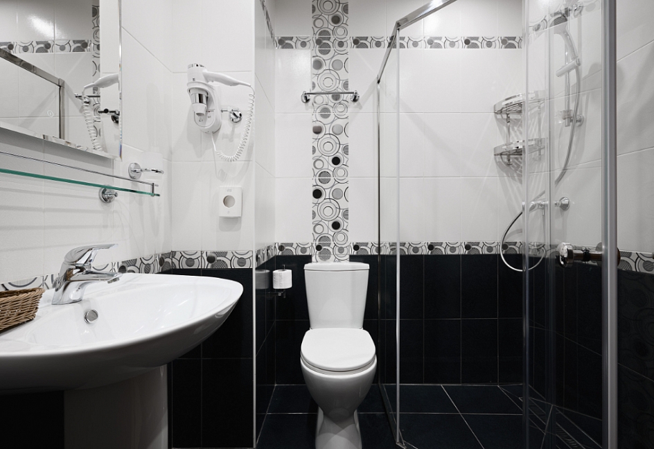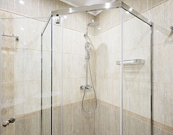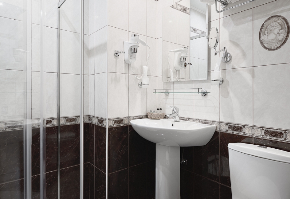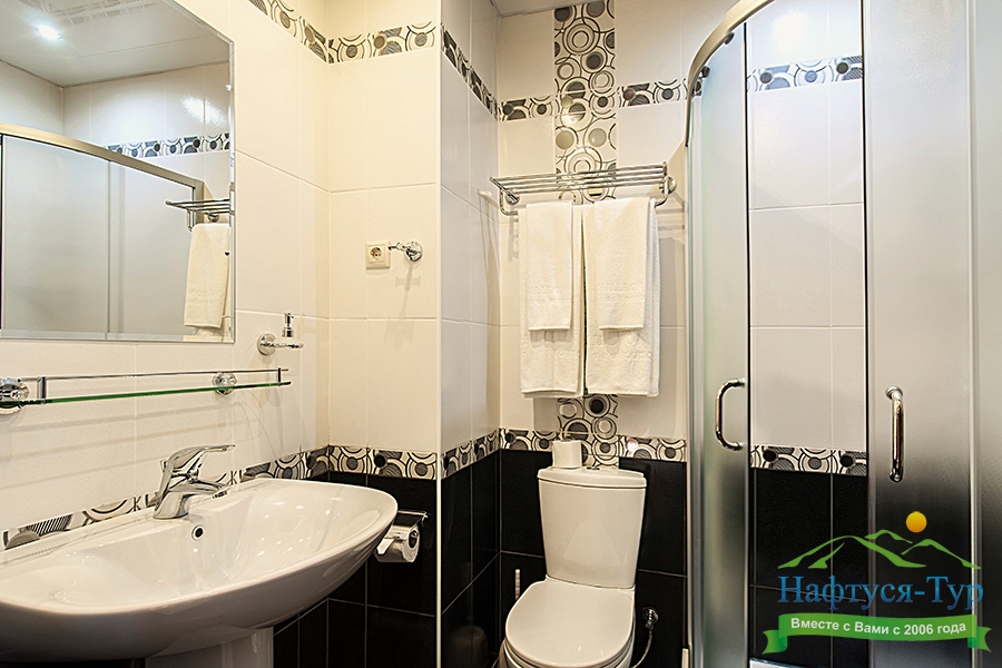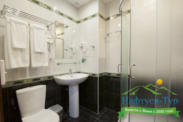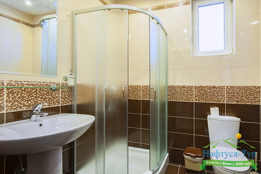 с душевой кабиной, тапочки, туалетные принадлежности, фен