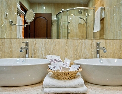 с душевой кабиной, тапочки, туалетные принадлежности, фен, халат