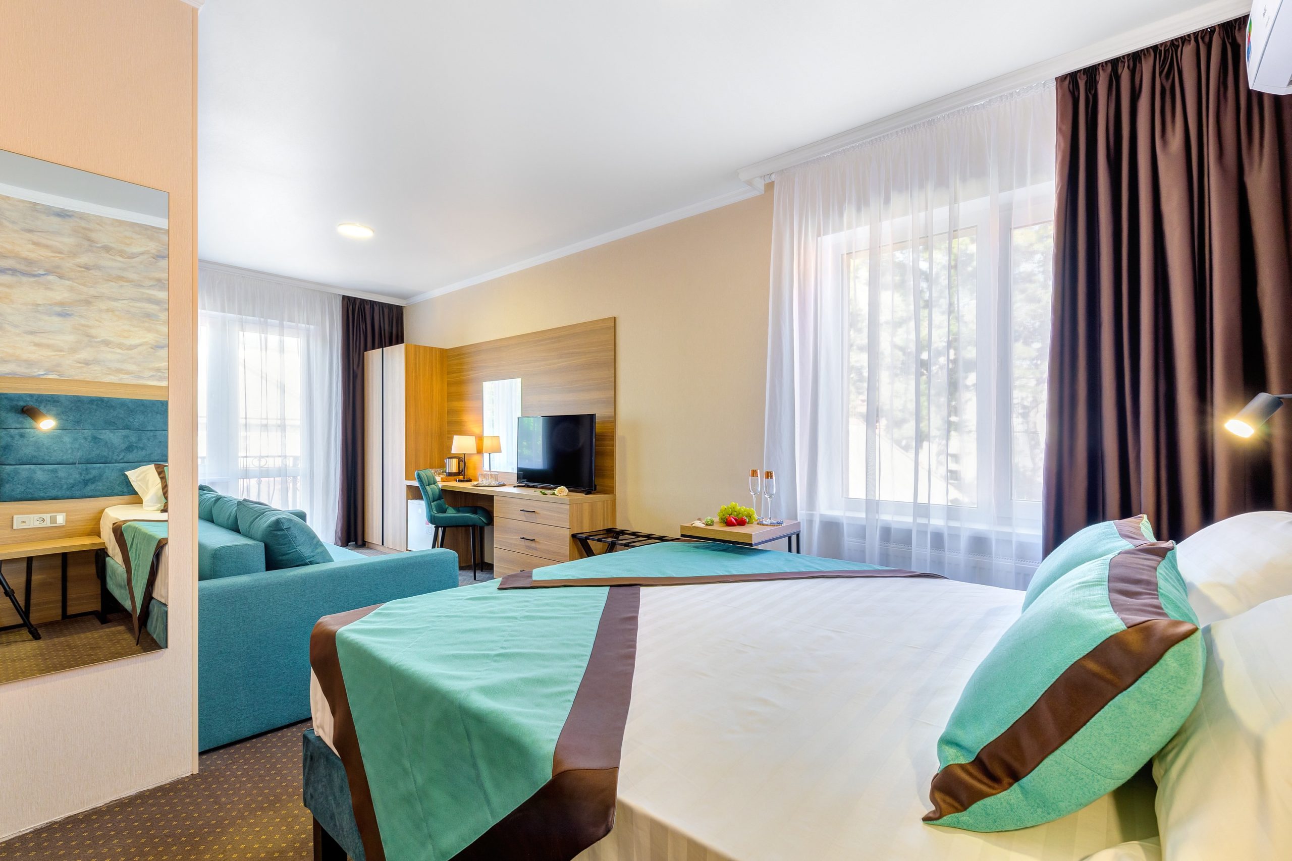 вешалка, диван, зеркало, кровати односпальные /одна двуспальная кровать, прикроватные тумбочки, стол, стул, шкаф