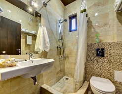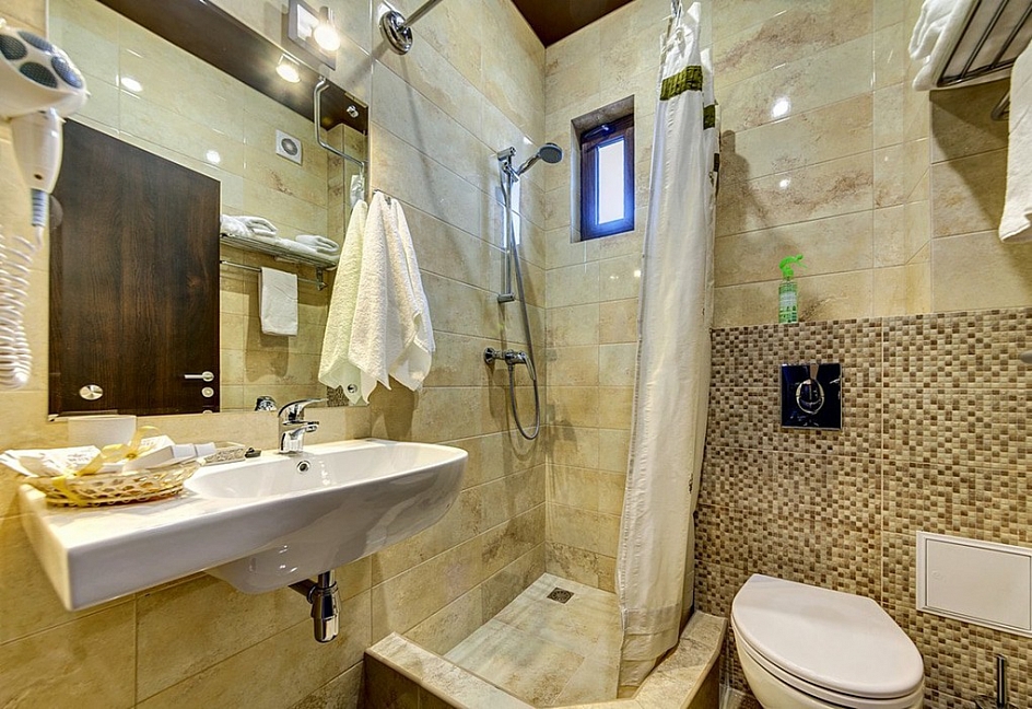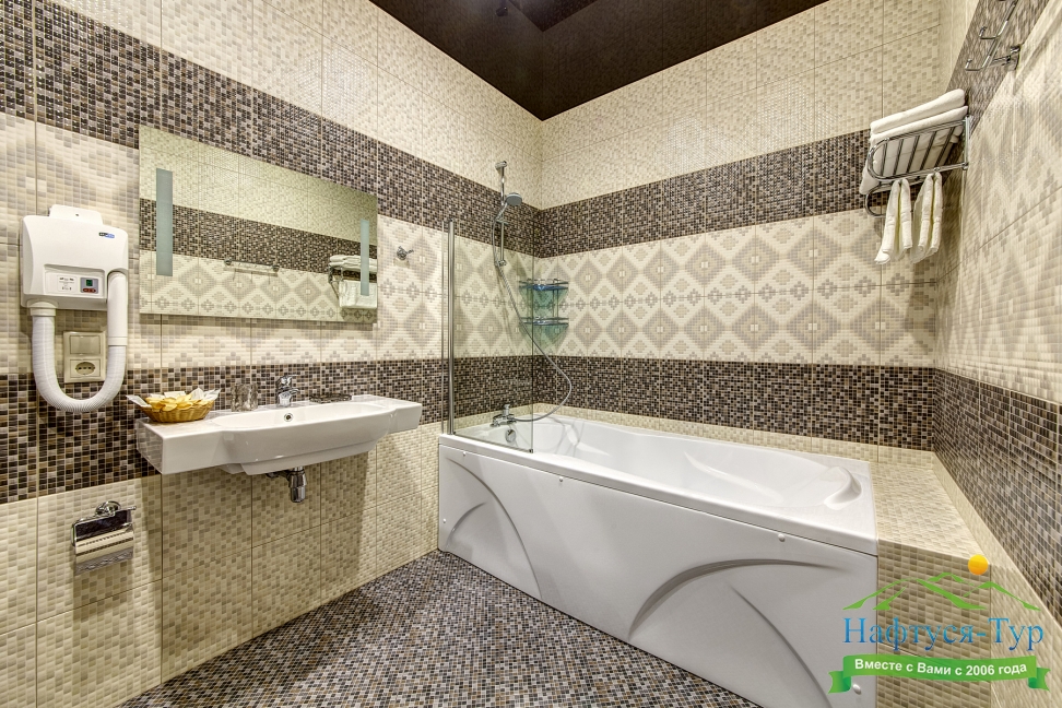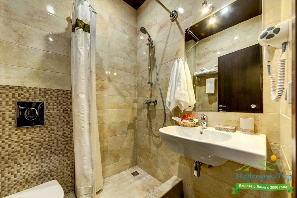 с душем, тапочки, туалетные принадлежности, фен, халат