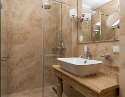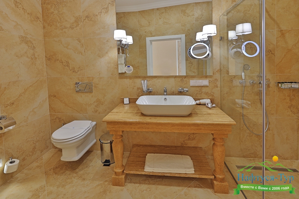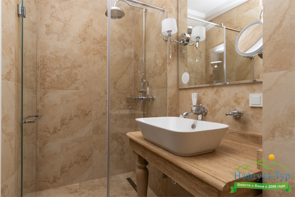 с душем, тапочки, туалетные принадлежности, фен, халат