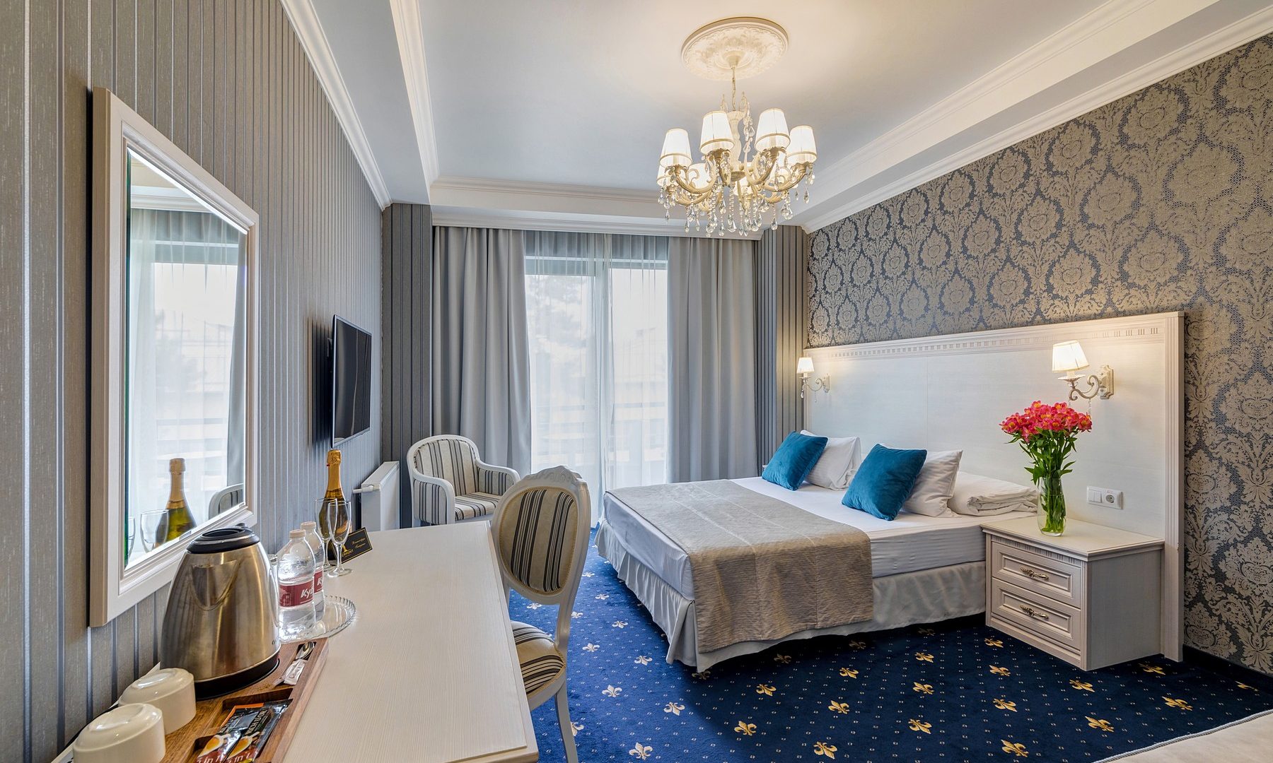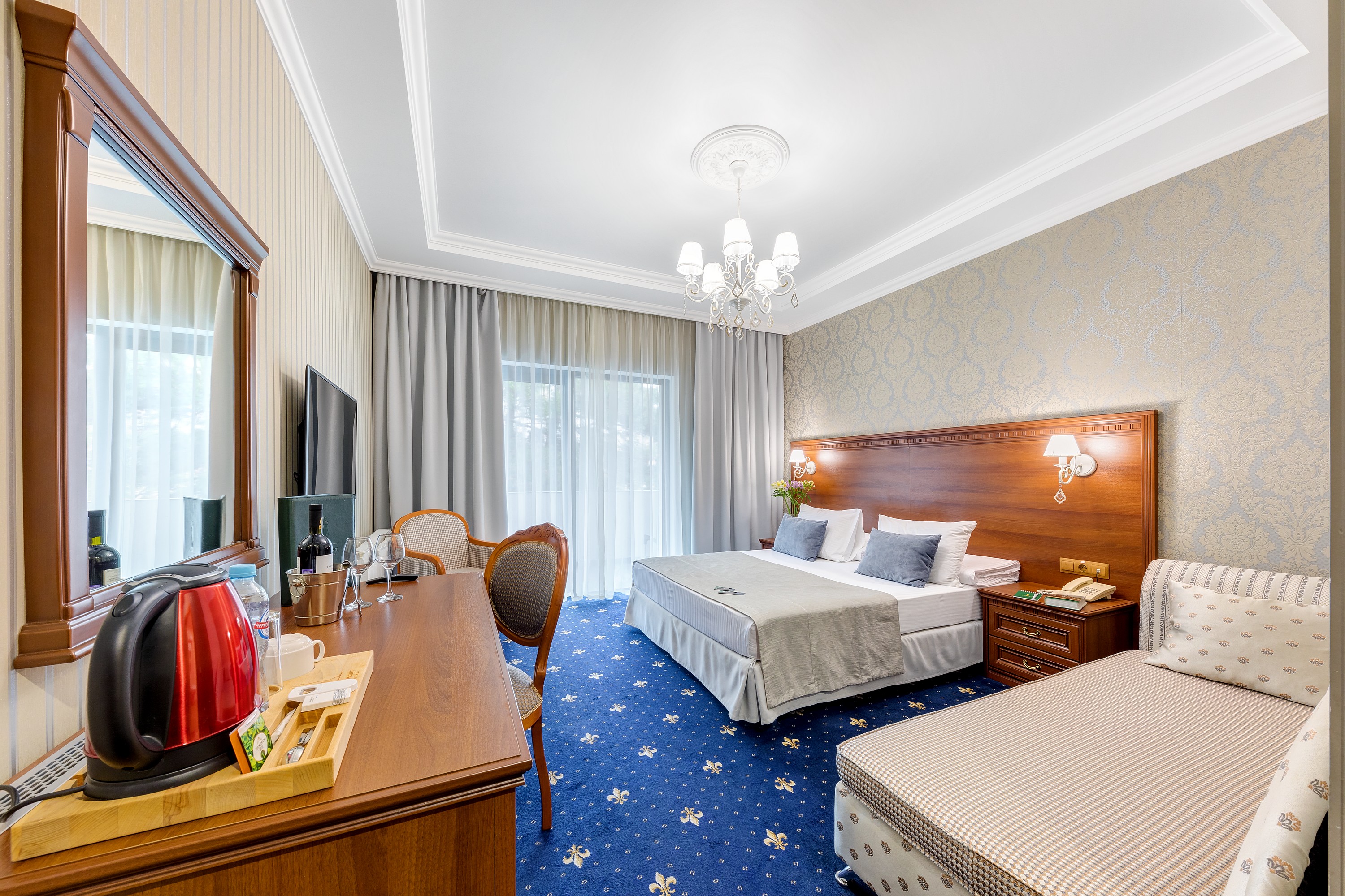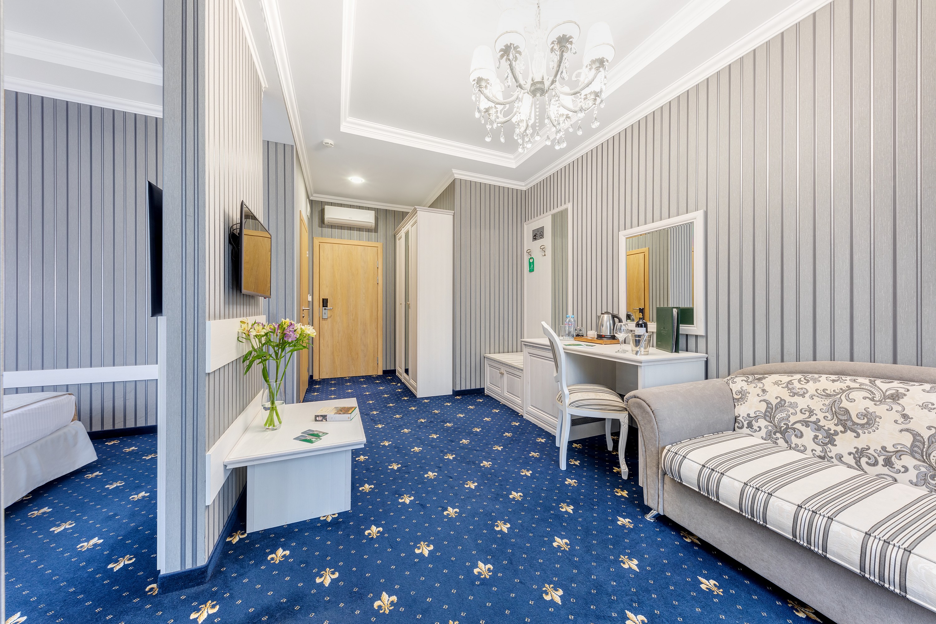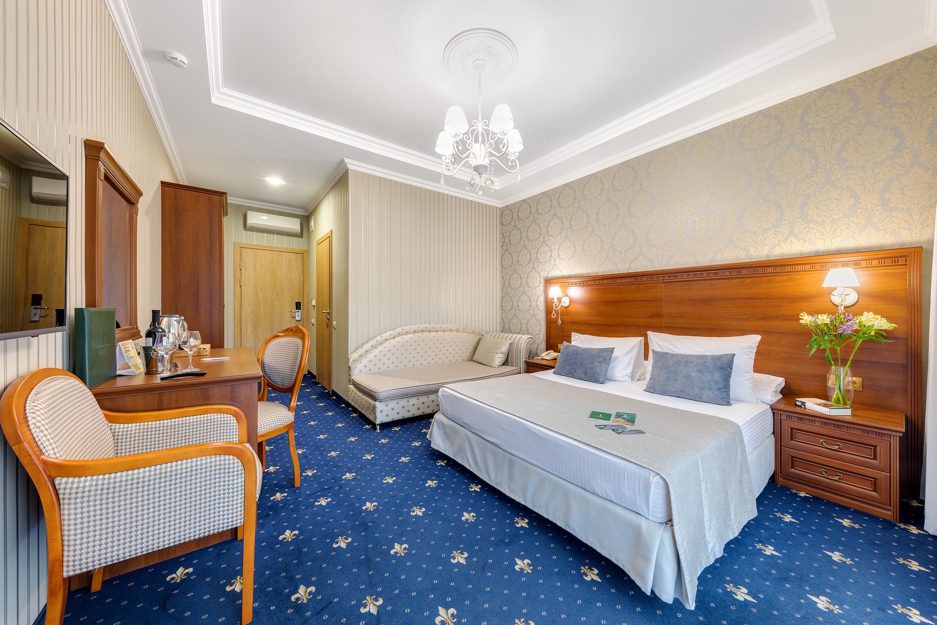 Большой номер. С новой комфортной мебелью. Отличный ремонт. В номере были все гигиенические принадлежности, халаты, каждый день в номер приносили воду. Идеальный удобный душ. Очень вкусные и обильные завтраки.