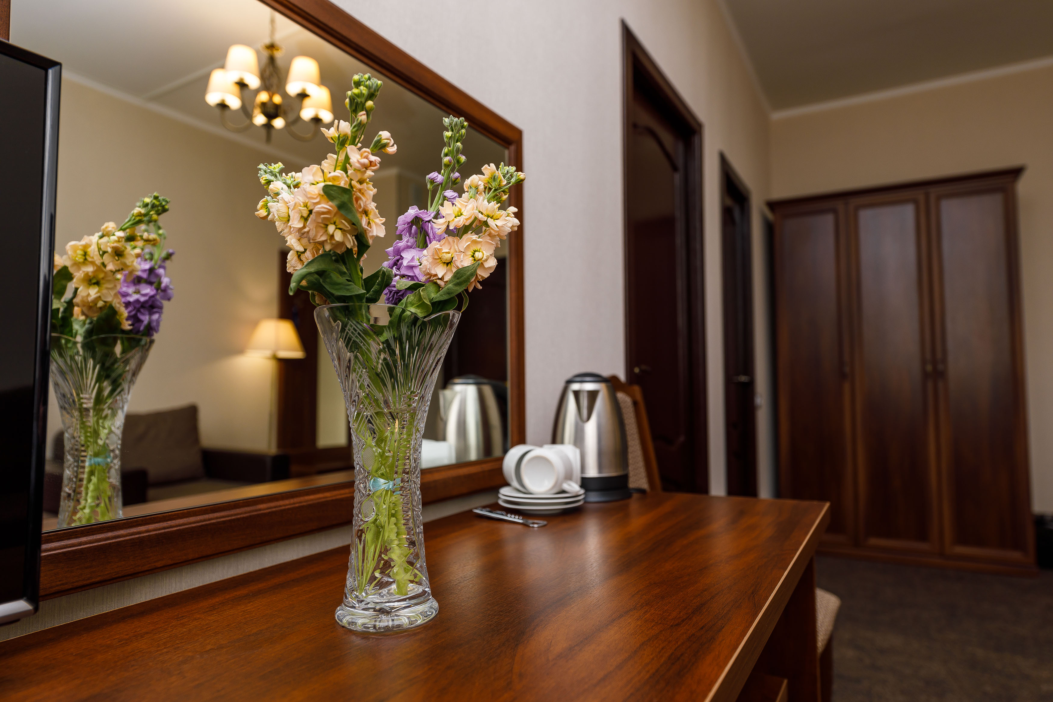 вешалка, диван раскладной, зеркало, кресло-кровать, кровати односпальные /одна двуспальная кровать, прикроватные тумбочки, столик журнальный, столик туалетный, стул, шкаф