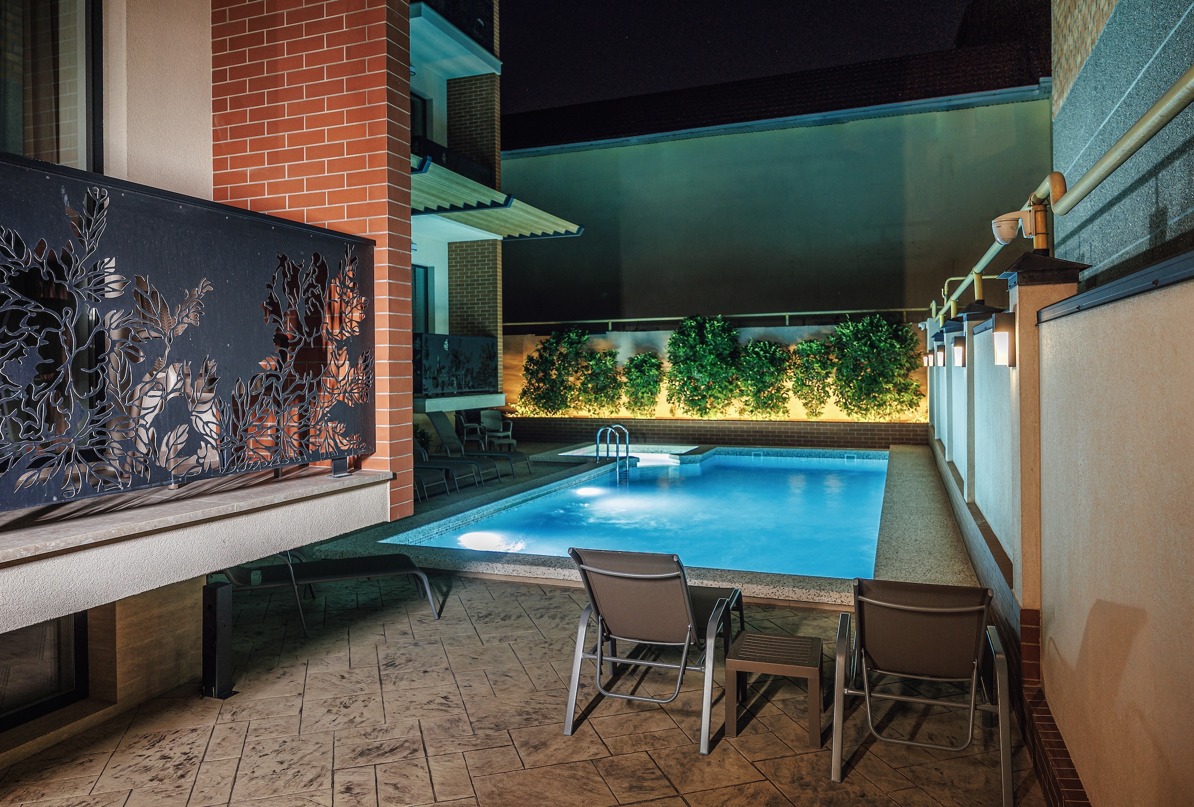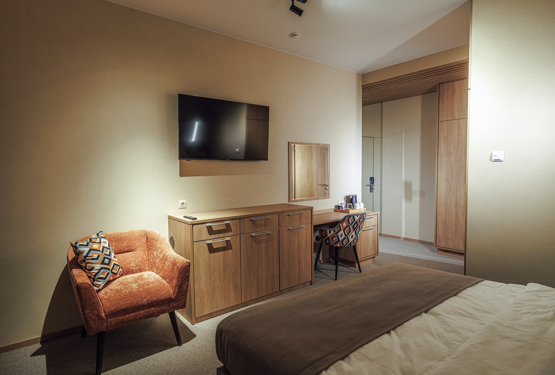 вешалка, зеркало, ковровое покрытие, кресло, кровать двуспальная, прикроватные тумбочки, стол, стул, шкаф