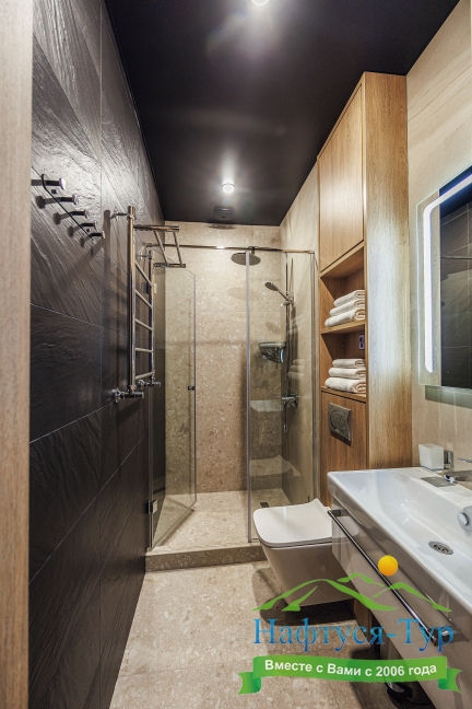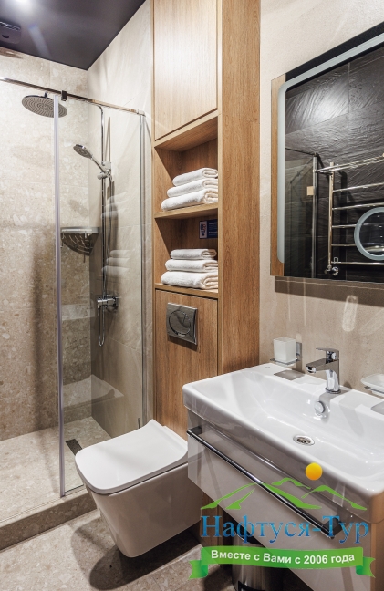 с душевой кабиной, туалетные принадлежности, фен