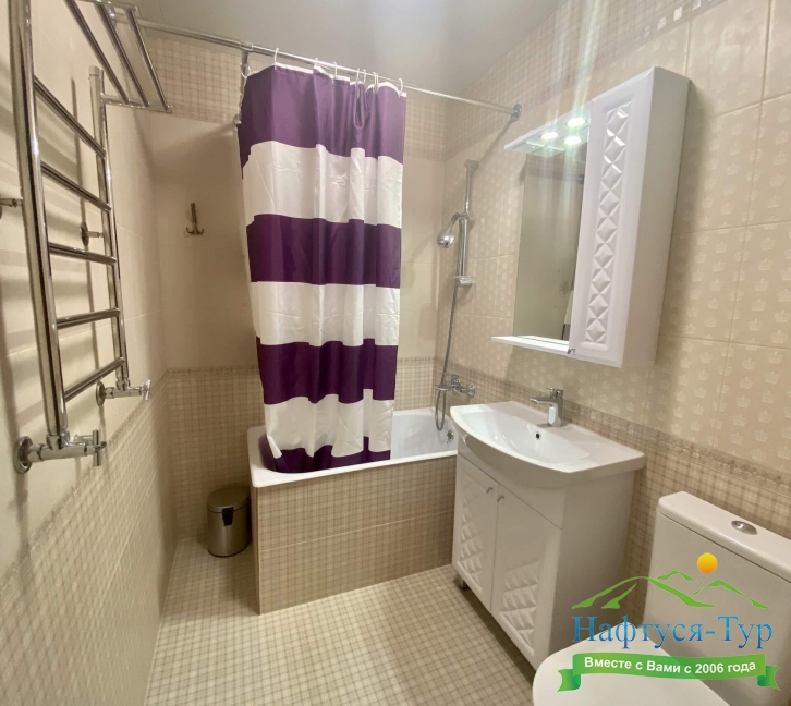 с душем, тапочки, туалетные принадлежности, фен, халат