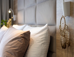 вешалка, зеркало, кресло-кровать, кровать двуспальная, прикроватные тумбочки, стол, стулья, шкаф