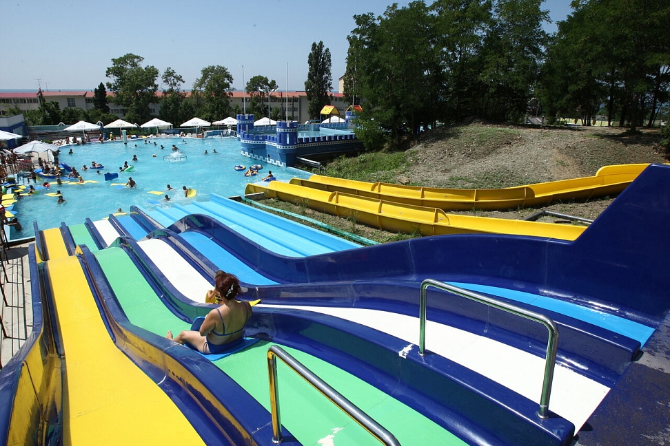 Круглогодичный аквапарк с морской водой. Шум прибоя нашего волнового, подогреваемого бассейна с имитацией морских волн, удобные шезлонги, термальный комплекс, 15 бассейнов с морской водой, горки с экстремальными спусками — всё это, аквапарк, доступный круглый год!