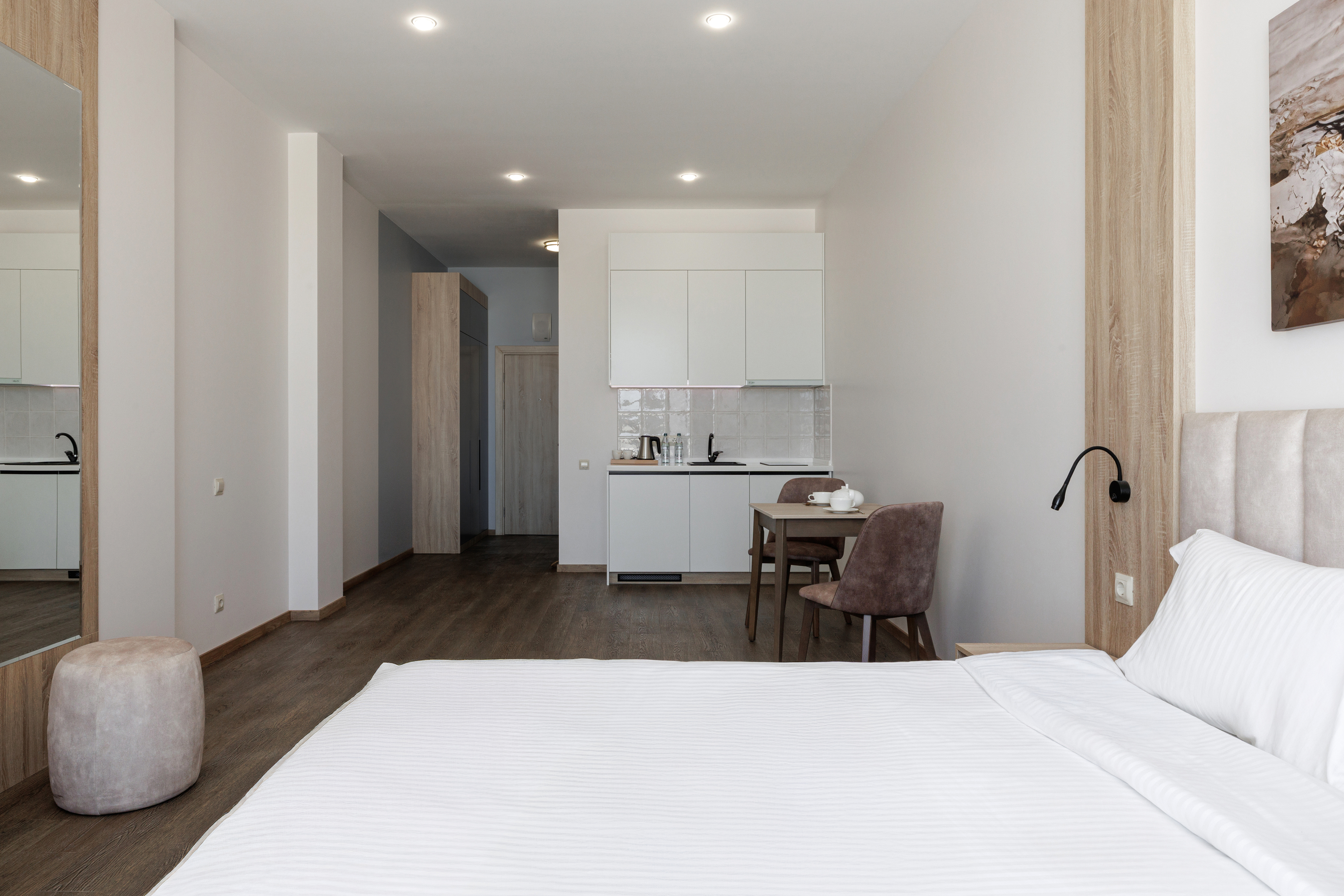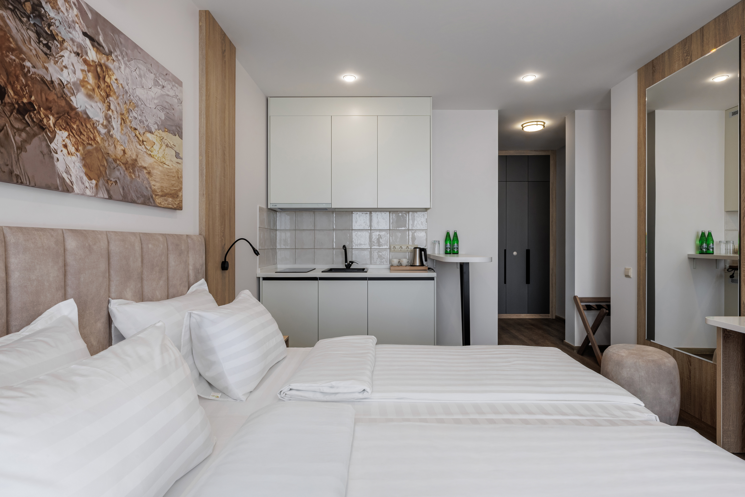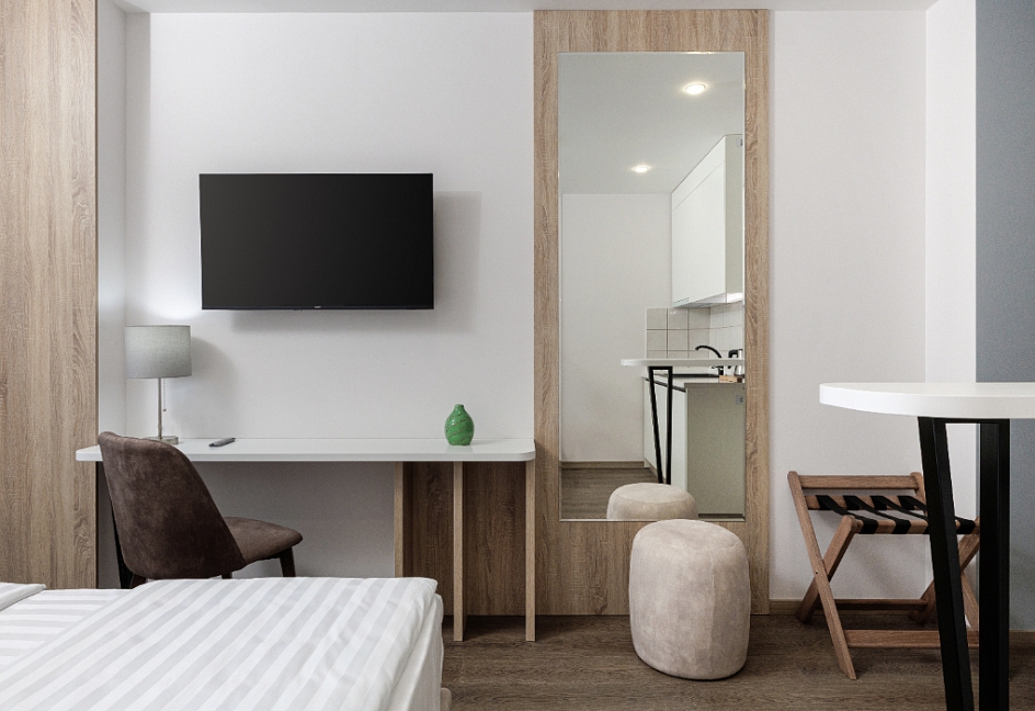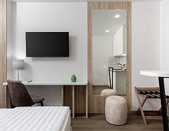 зеркало, кровати односпальные /одна двуспальная кровать, прикроватная тумбочка, пуфик, стол, стул, шкаф