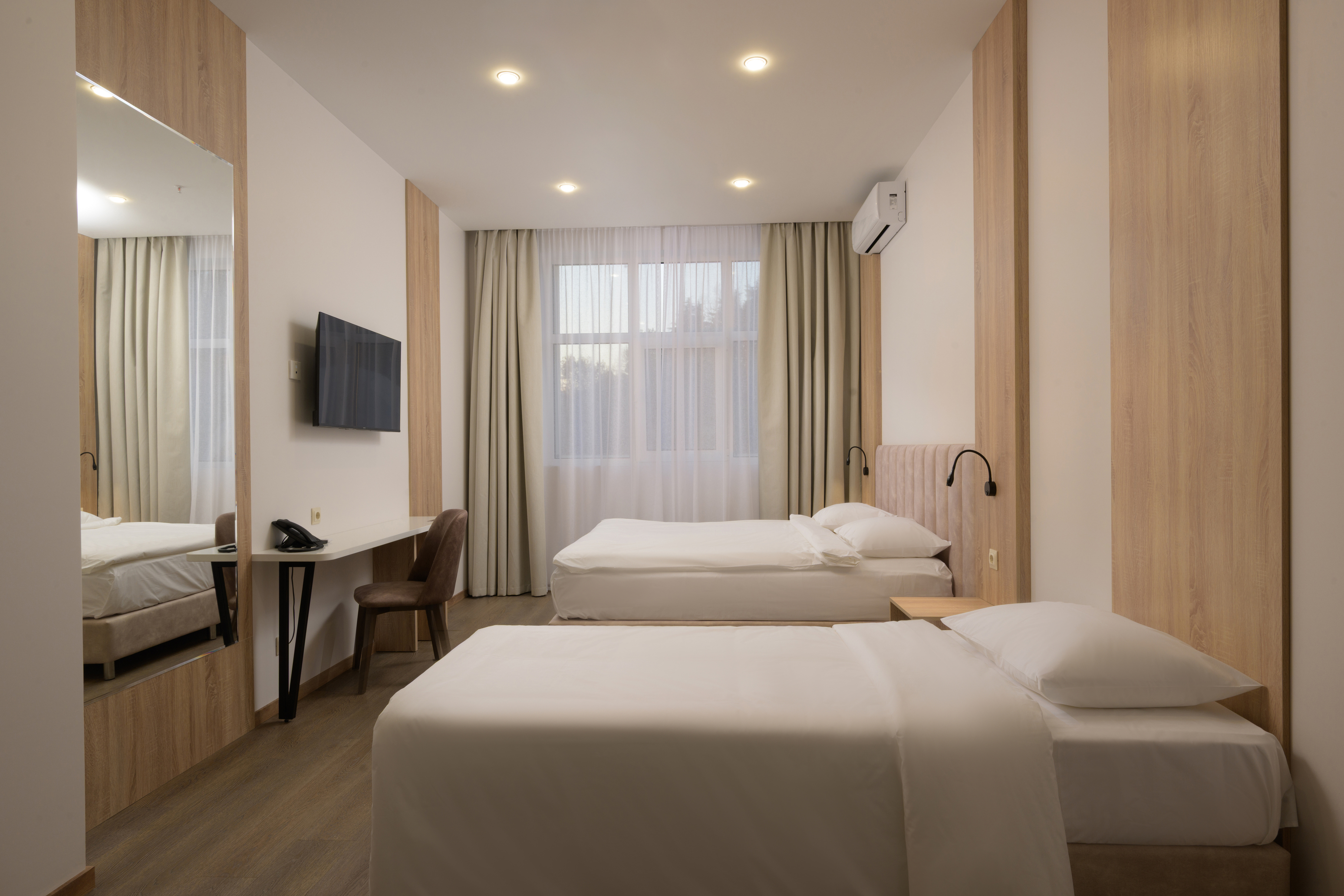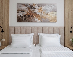 зеркало, кровати односпальные /одна двуспальная кровать, прикроватные тумбочки, пуфик, стол, стул, шкаф