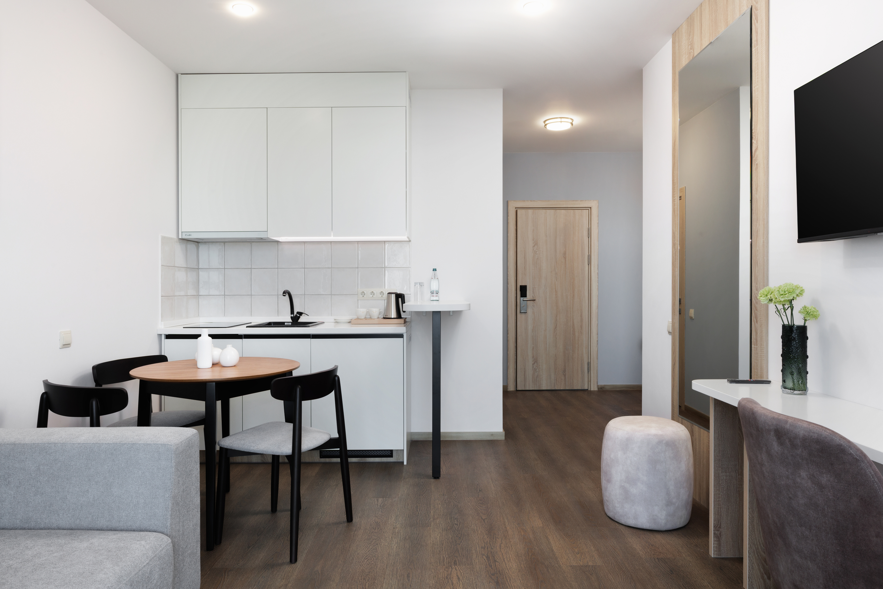 зеркало, кровати односпальные, прикроватные тумбочки, пуфик, стол, стол обеденный, стулья, шкаф
