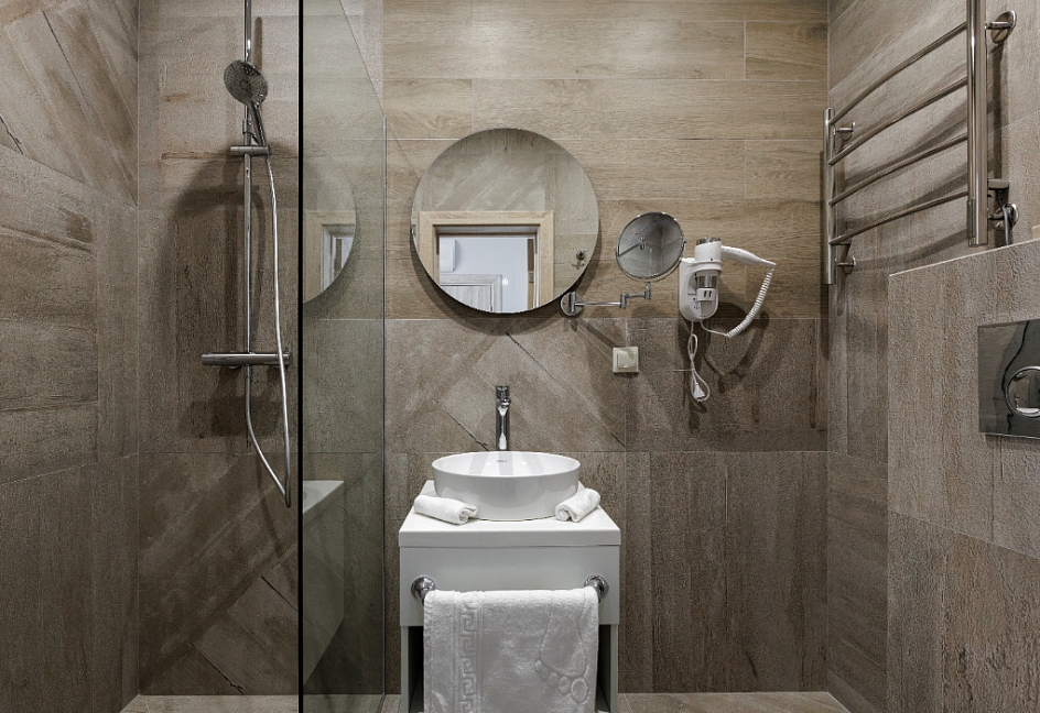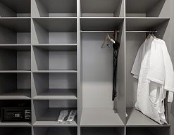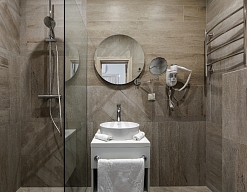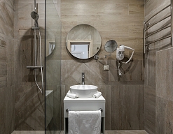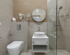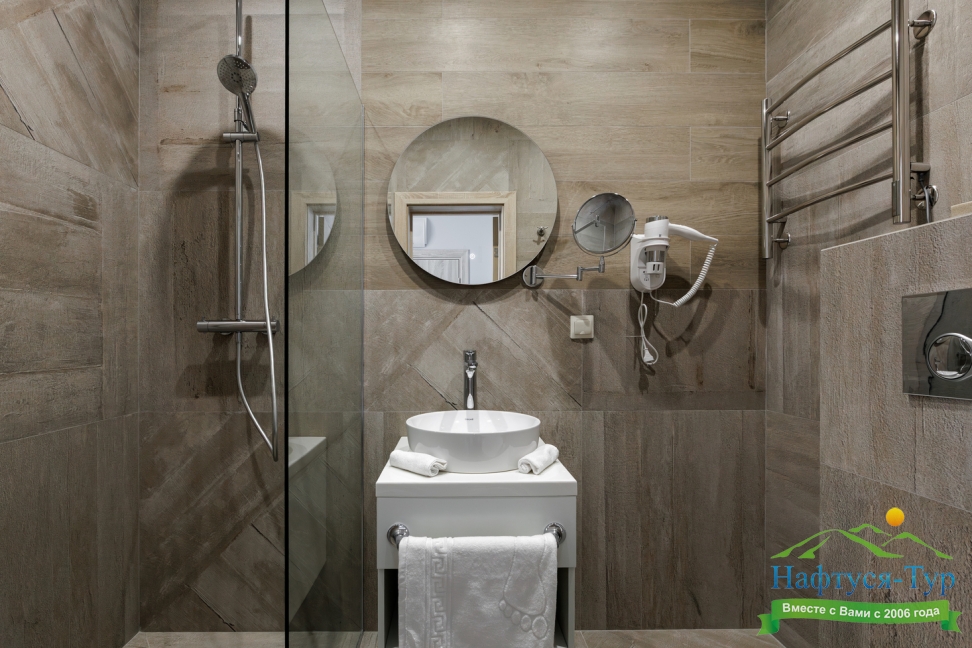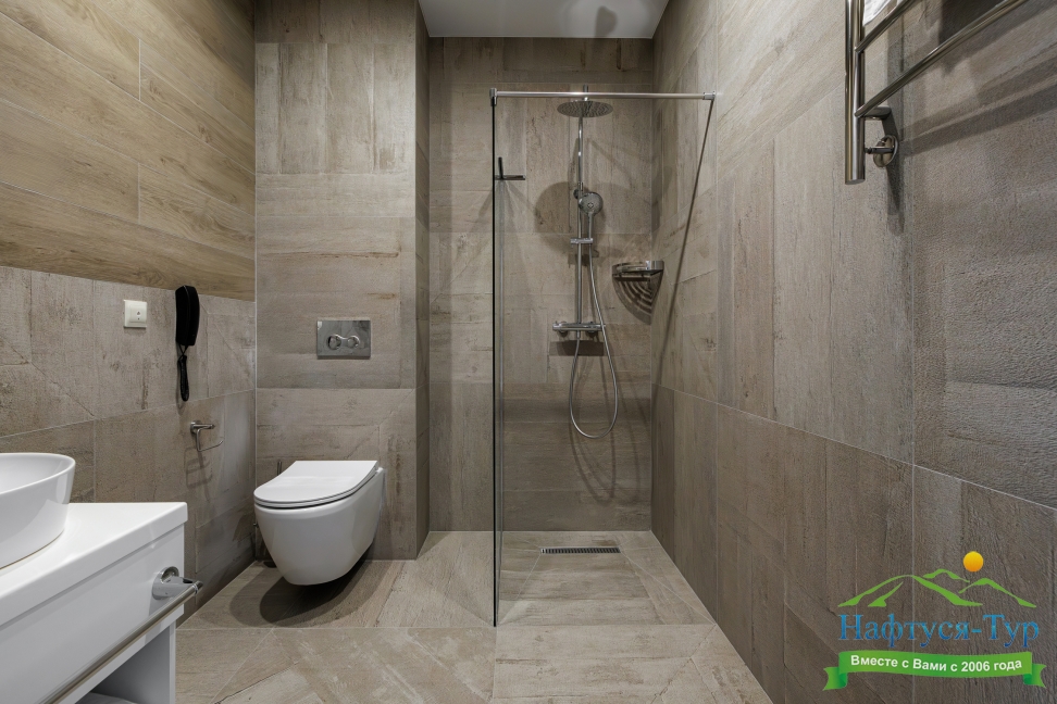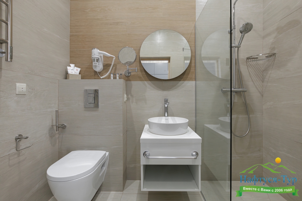 с душевой кабиной, тапочки, туалетные принадлежности, фен, халат