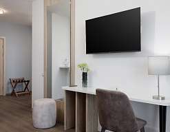 гладильная доска, кондиционер, мини-холодильник, набор посуды, плита электрическая, сейф, телевизор ЖК, телефон, утюг, чайная станция