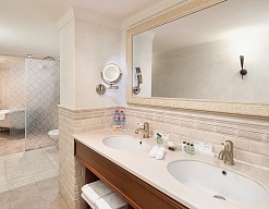 биде, с ванной и душевой кабиной, тапочки, туалетные принадлежности, фен, халат