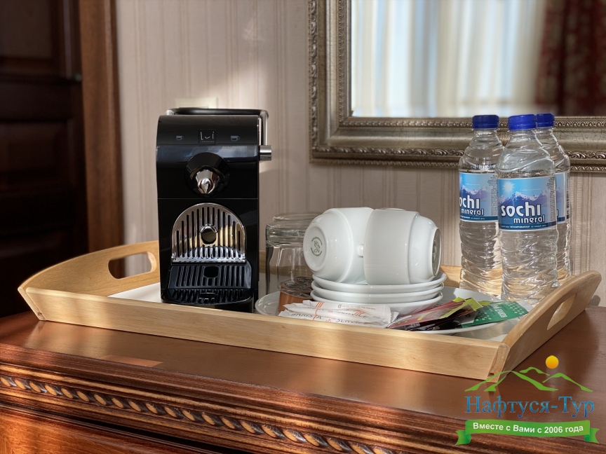 кондиционер, кофемашина, мини-холодильник, сейф, телевизор ЖК, телефон, чайный набор посуды, электрочайник