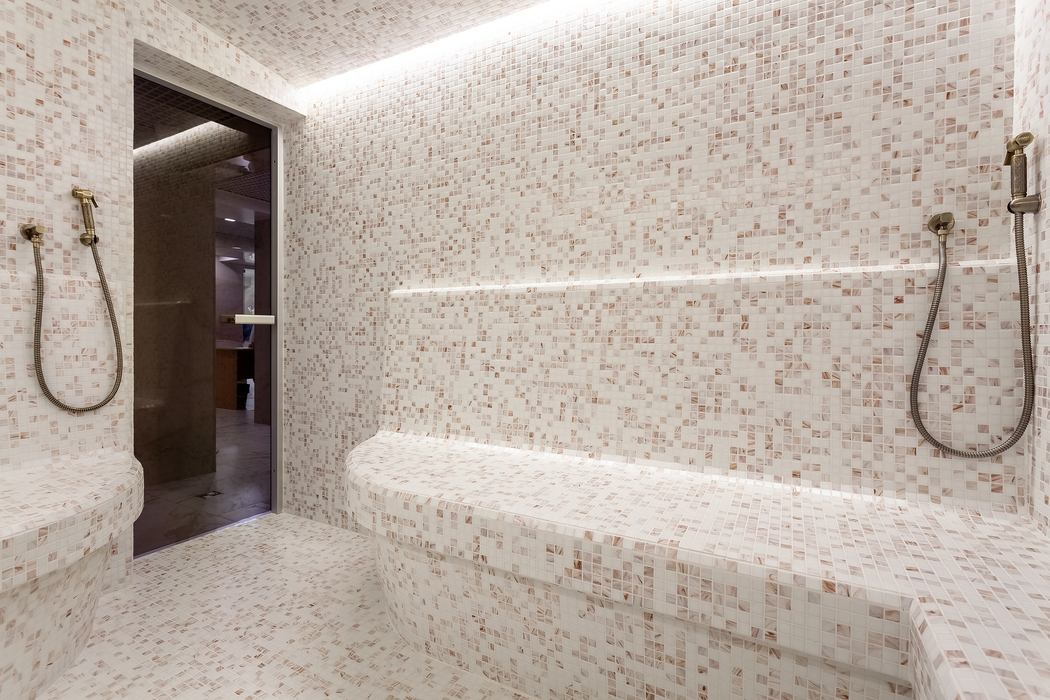 с душем, тапочки, туалетные принадлежности, фен, халат