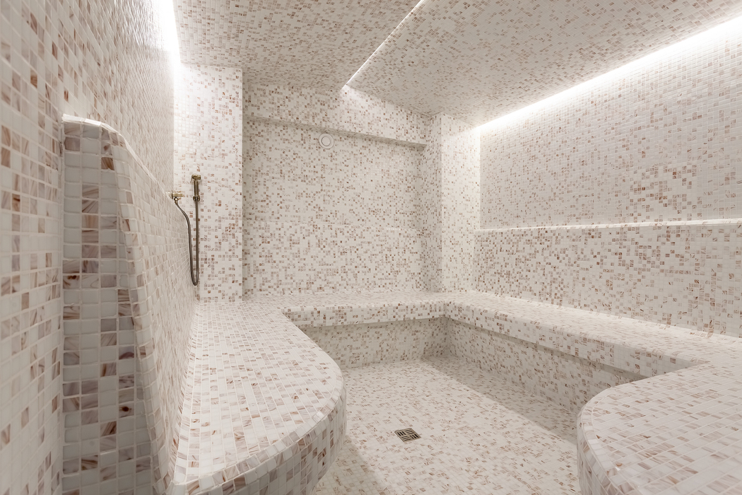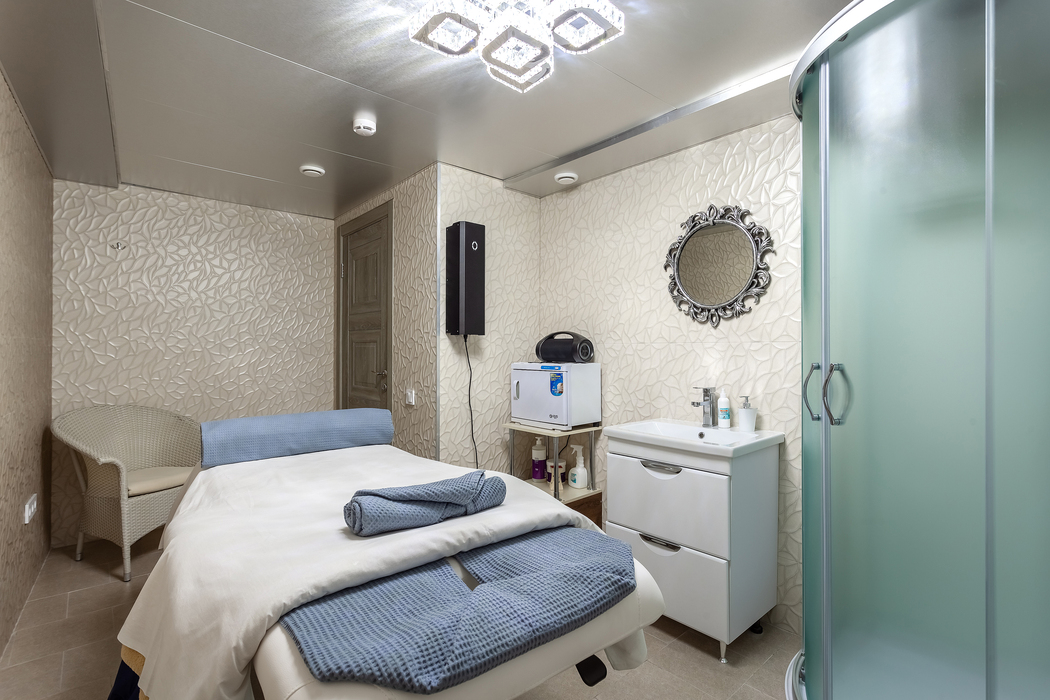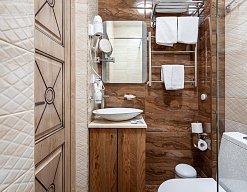 с душевой кабиной, тапочки, туалетные принадлежности, фен